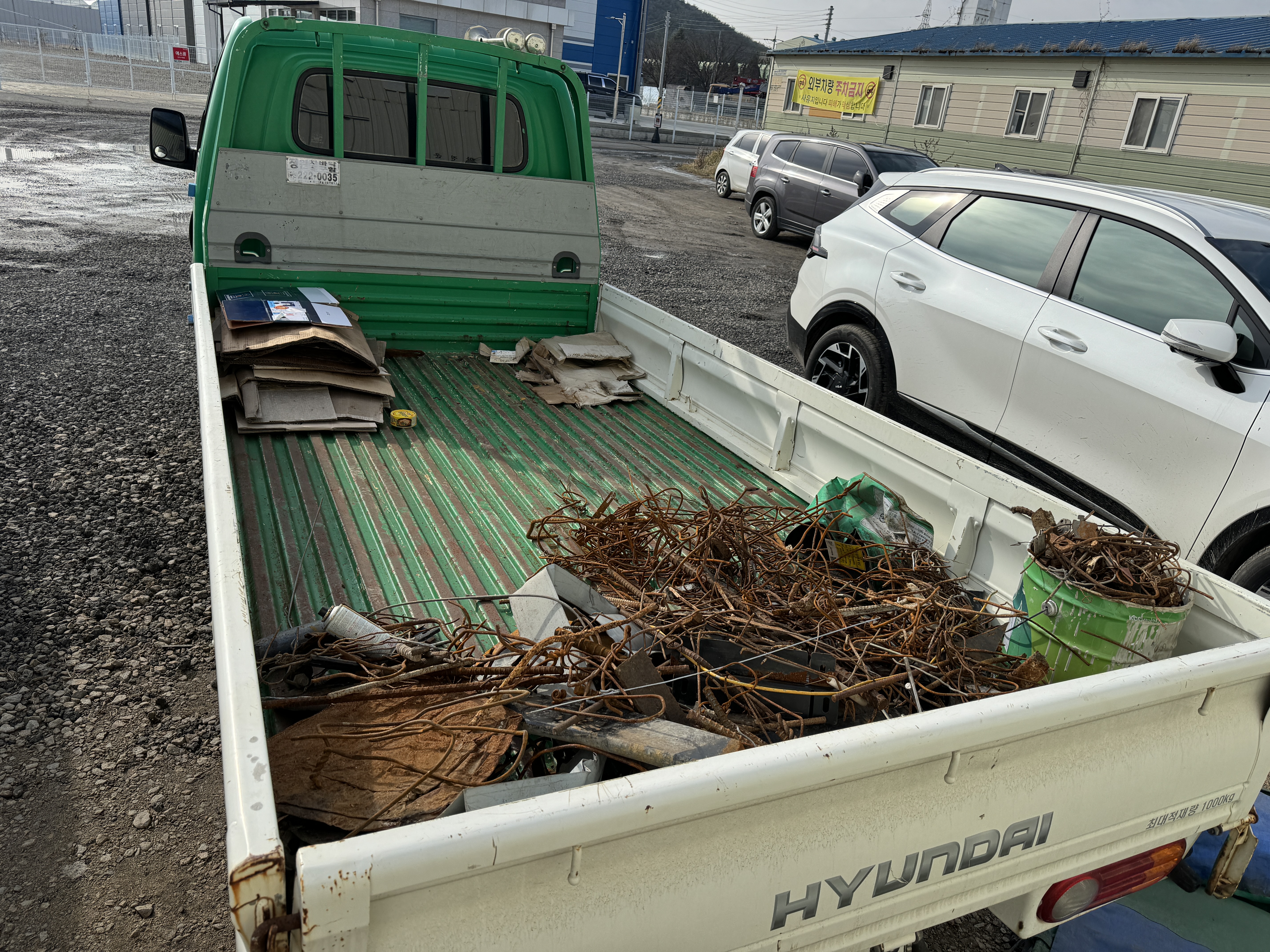 포터를 가져온지 얼마 안됐을 때 주변 도로에 방통차가 흘리고 간 고철들을 주워놓기도 했습니다만, 그렇게 주워온 고철은 일부고 그간 사무실 앞에 석달 가까이 모아둔 고철들을 상차하여 적재함 뒷편으로 몰아버립니다. 바닥에 버려놨을때는 그리 많지 않아보였는데 포터에 올리니 반생이들이 많아서 그럭저럭 부피가 좀 있어보이네요.