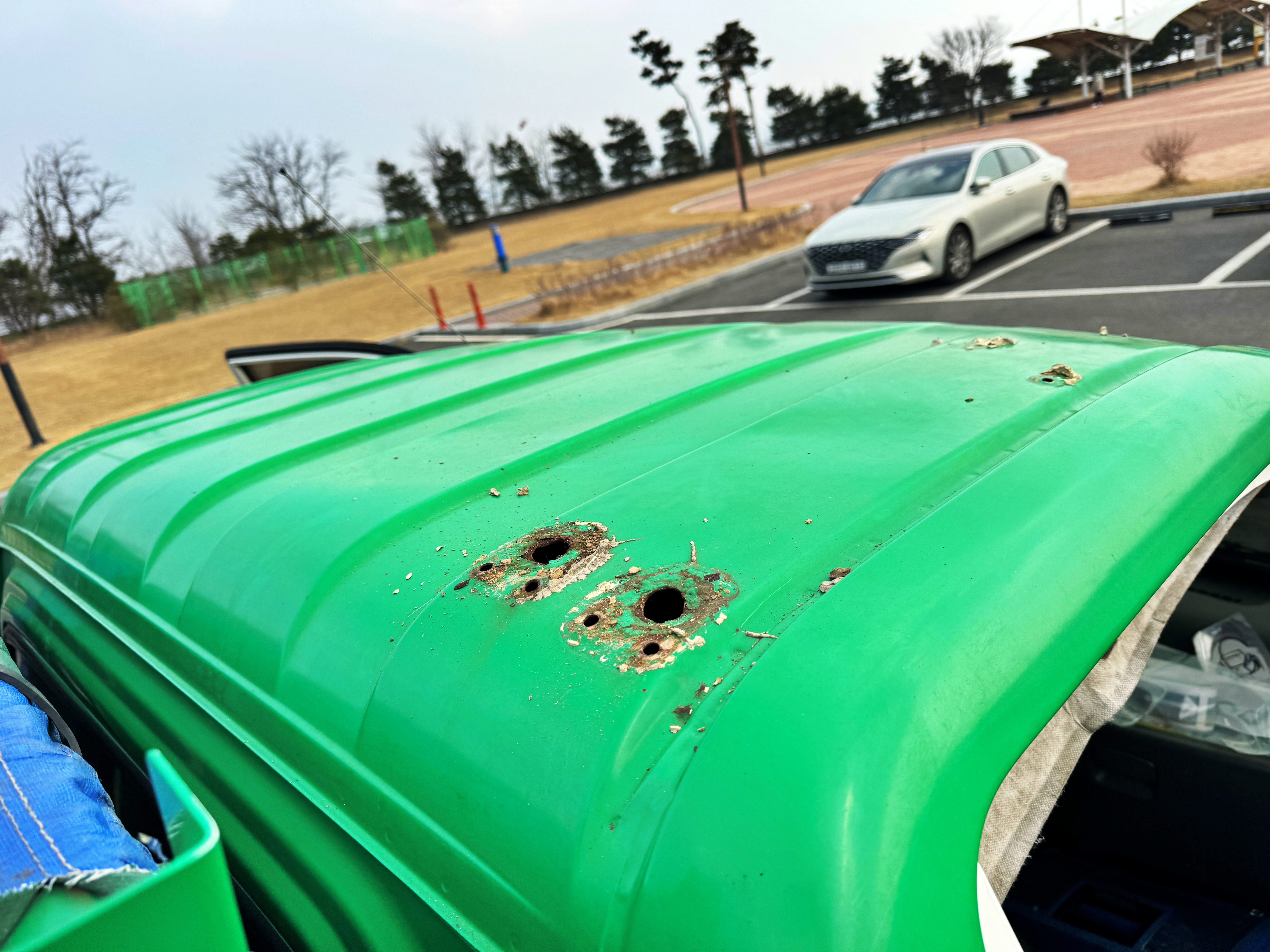 에어혼을 달기 위해 천장에 구멍을 뚫었습니다. 에어호스가 들어가야 하기에 꽤 큰 구멍을 뚫어야 합니다. 엄지손가락도 거뜬히 들어가는 구멍이 참 보기 싫게 났습니다. 방청처리를 잘 하지 않아 부식도 좀 있고요.