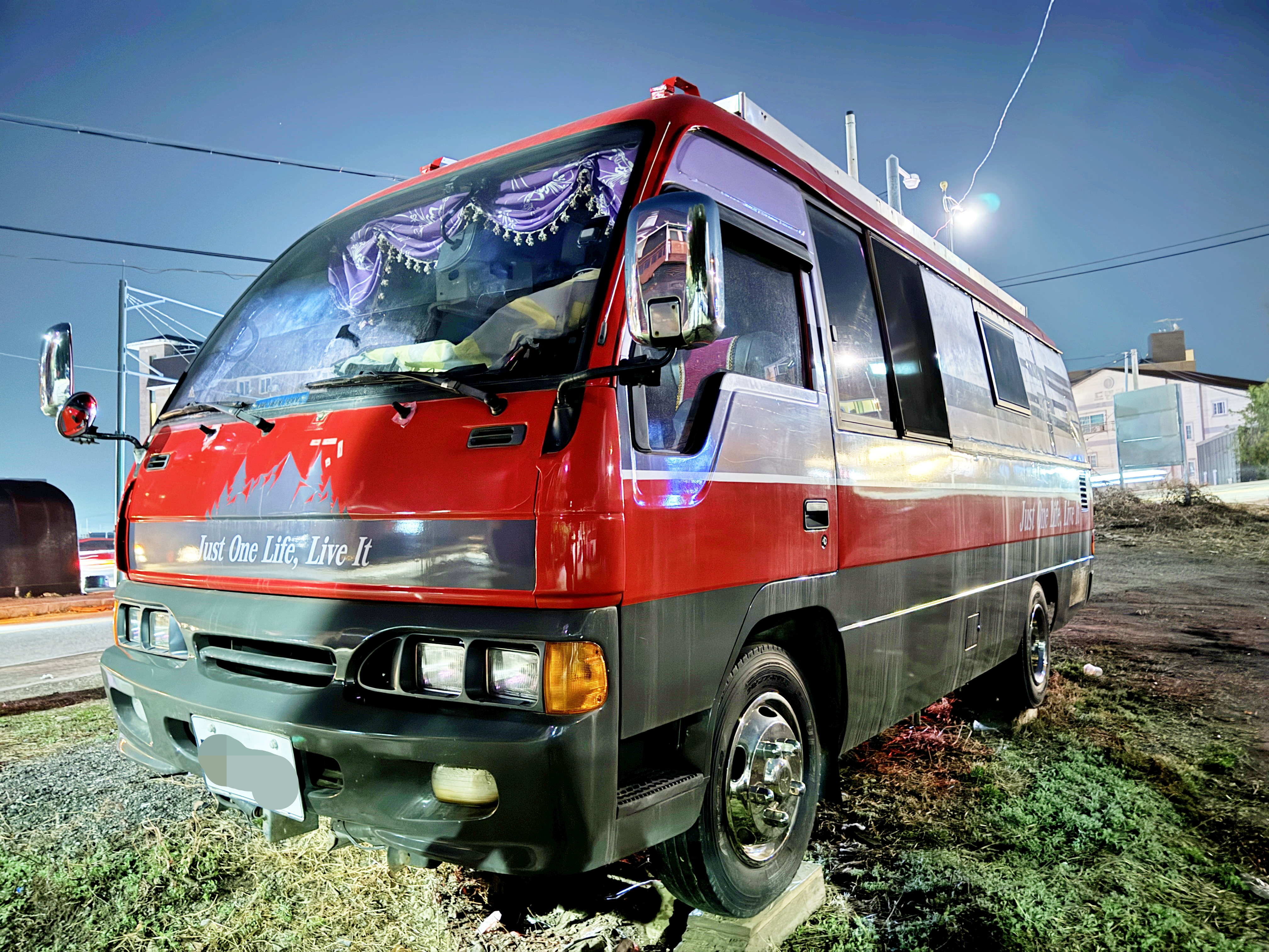헤드램프 안쪽으로 에어덕트가 존재합니다. 냉각을 위한 설계로 보입니다. 늦은 밤에 보고 왔던지라 자세한 모습을 볼 순 없어 아쉬웠지만 언제 목격했는지 기억조차 나지 않는 코러스를 이렇게 가까이에서 볼 수 있었다는 사실만으로도 영광스럽게 생각합니다. 판매 당시에는 미니버스의 대명사 콤비에 밀렸고 단종 이후에도 딱히 조명받지 못했던 차량인지라 기억하는 사람도 많지 않습니다만 오랜 세월 차주분과 함께 캠핑카로서 그 역할을 성실히 수행하며 살아남아줬으면 좋겠습니다.