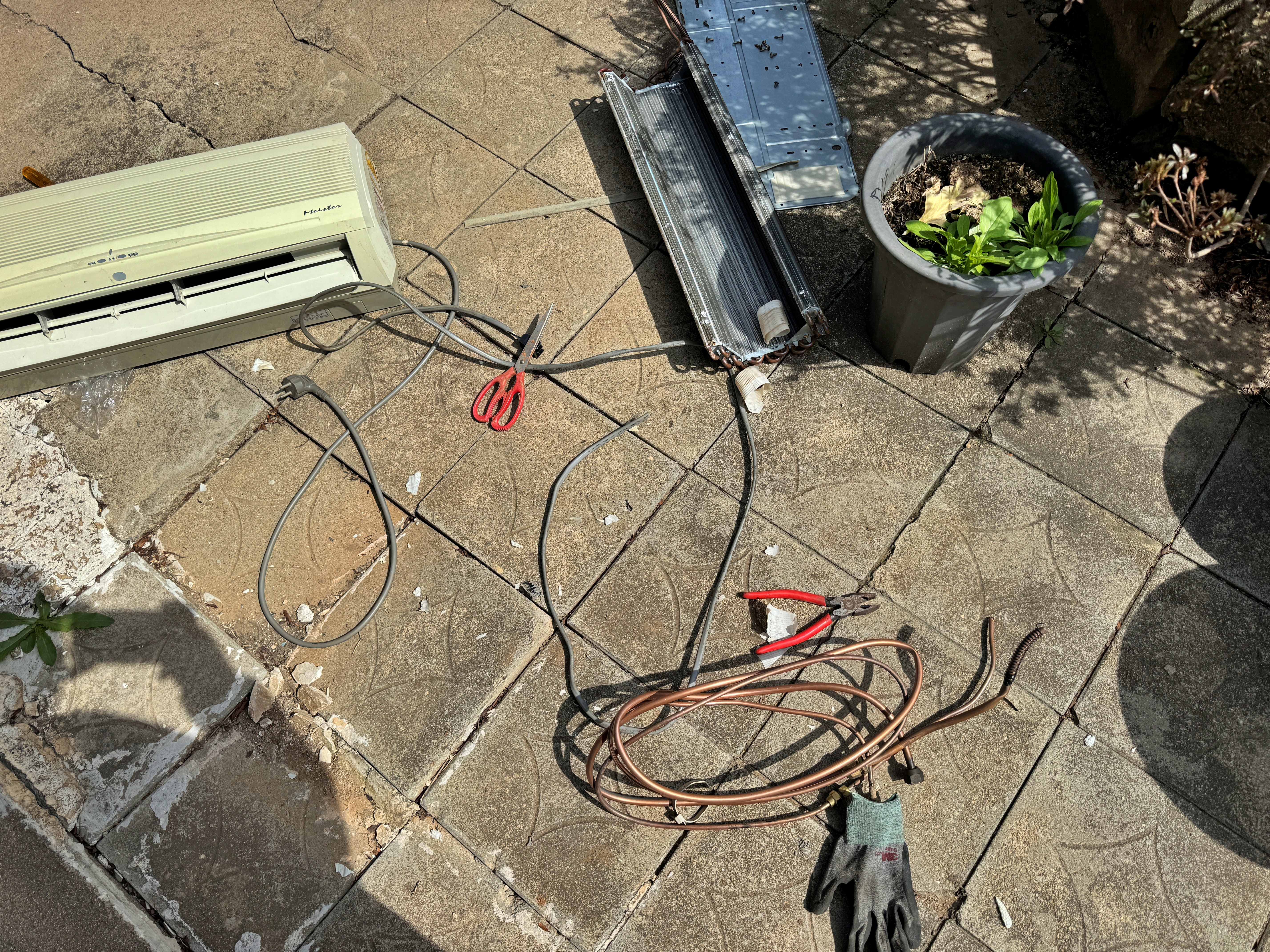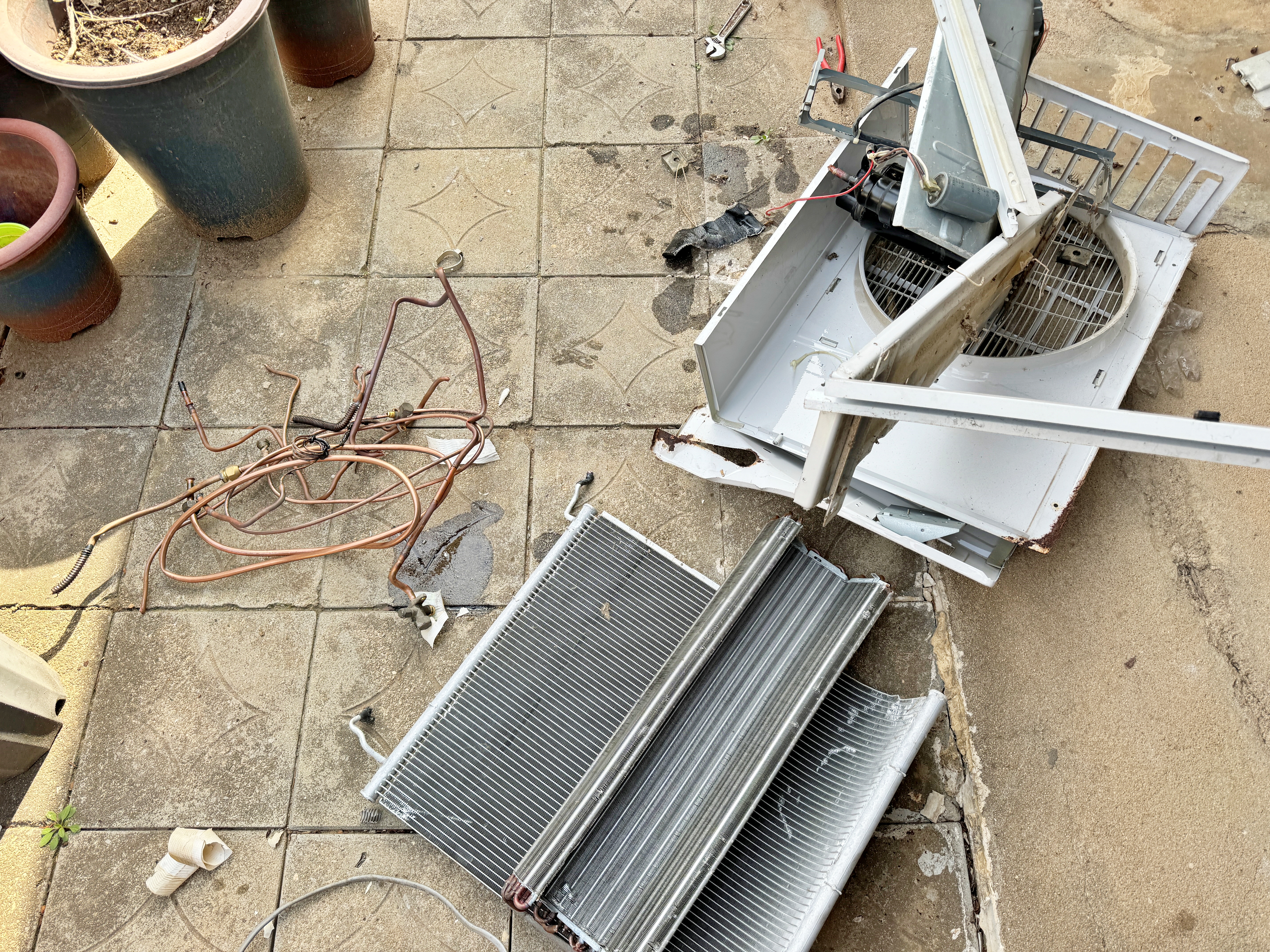 동파이프가 타공된 부위에서 꺾여 들어가진 않아서 그냥 밖에서 잡아당기니 쉽게 빠지는군요. 여기까지만 마무리해도 됩니다만, 저는 이 에어컨에서 얻을 수 있는 자원을 최대한 얻기 위해 실내기와 실외기를 분해한 뒤 자원별로 분리하려 합니다.