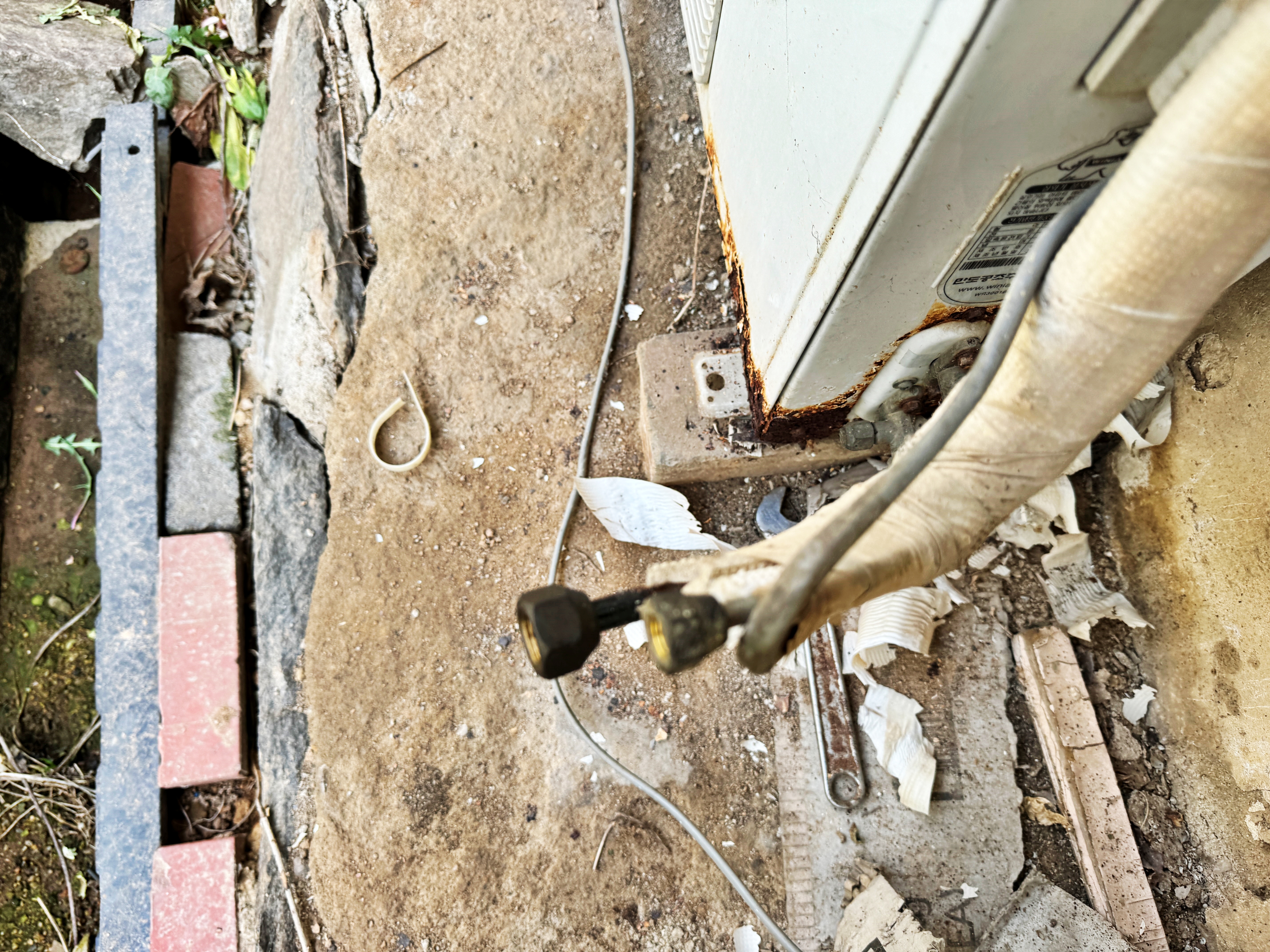 22년의 세월을 그 자리에서 가스 충전 없이 사용했으니 그간 단 한 번도 만져주지 않았을 겁니다. 그럼에도 쉽게 풀리네요. 가스가 있으면 가스가 새는 소리가 들린다는데 가스가 별로 없어서 그런지 새는 소리는 들리지 않았습니다. 살짝 풀어준 뒤 가스가 새는 소리가 줄어들 때 까지 놔두고 다시 조금씩 풀어주면 된다고 합니다. 그렇게 동파이프 연결부를 다 풀어줬습니다.