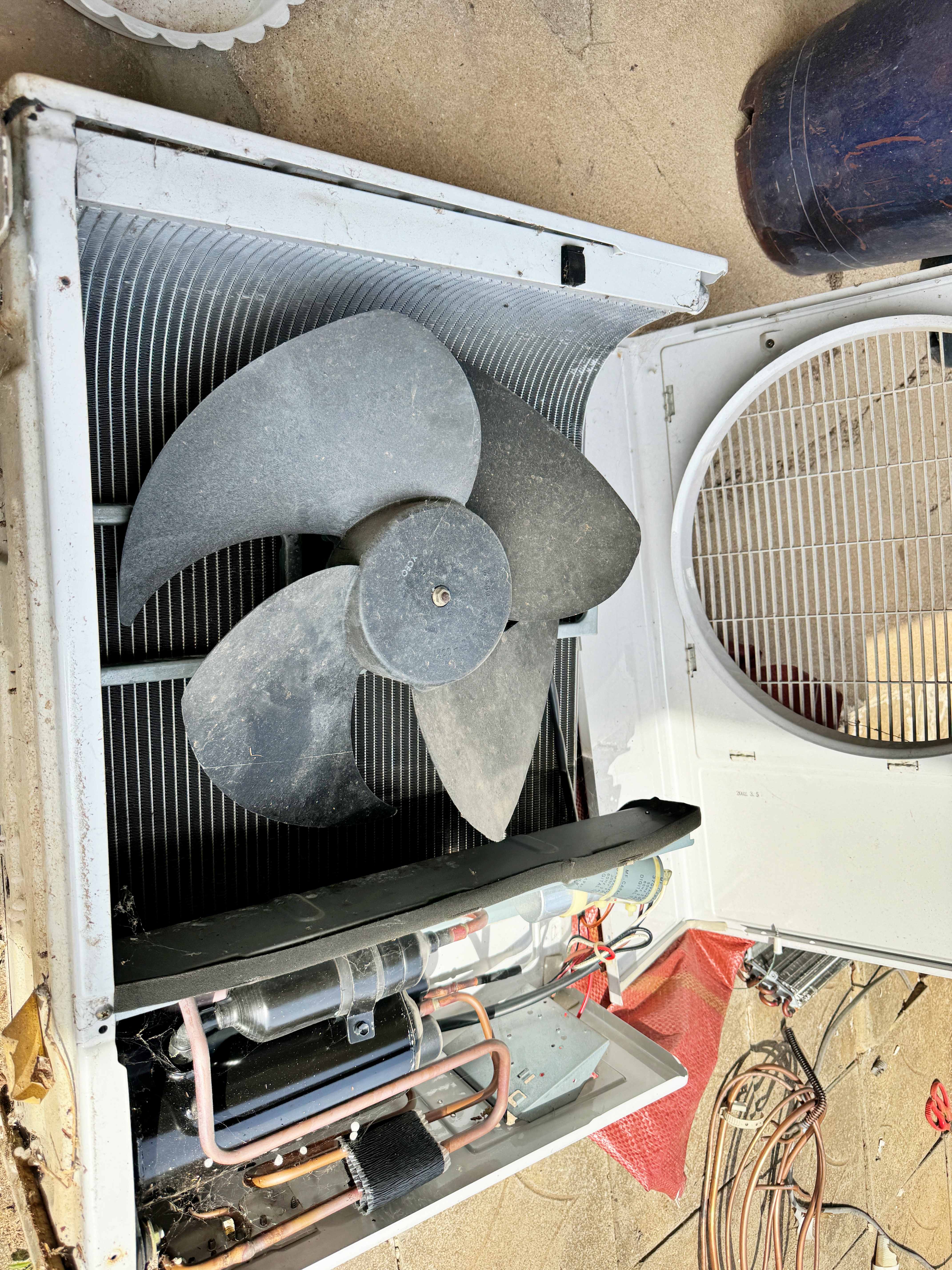 그래도 풀리긴 풀리네요. 실외기 커버는 철로 이루어져 있고, 내부에는 팬과 콘덴서 콤프레샤등이 존재합니다. 이 중 실외기 뒷면을 장식하는 콘덴서와 콤프레샤와 이어지는 동파이프만 따로 분리하려 합니다.