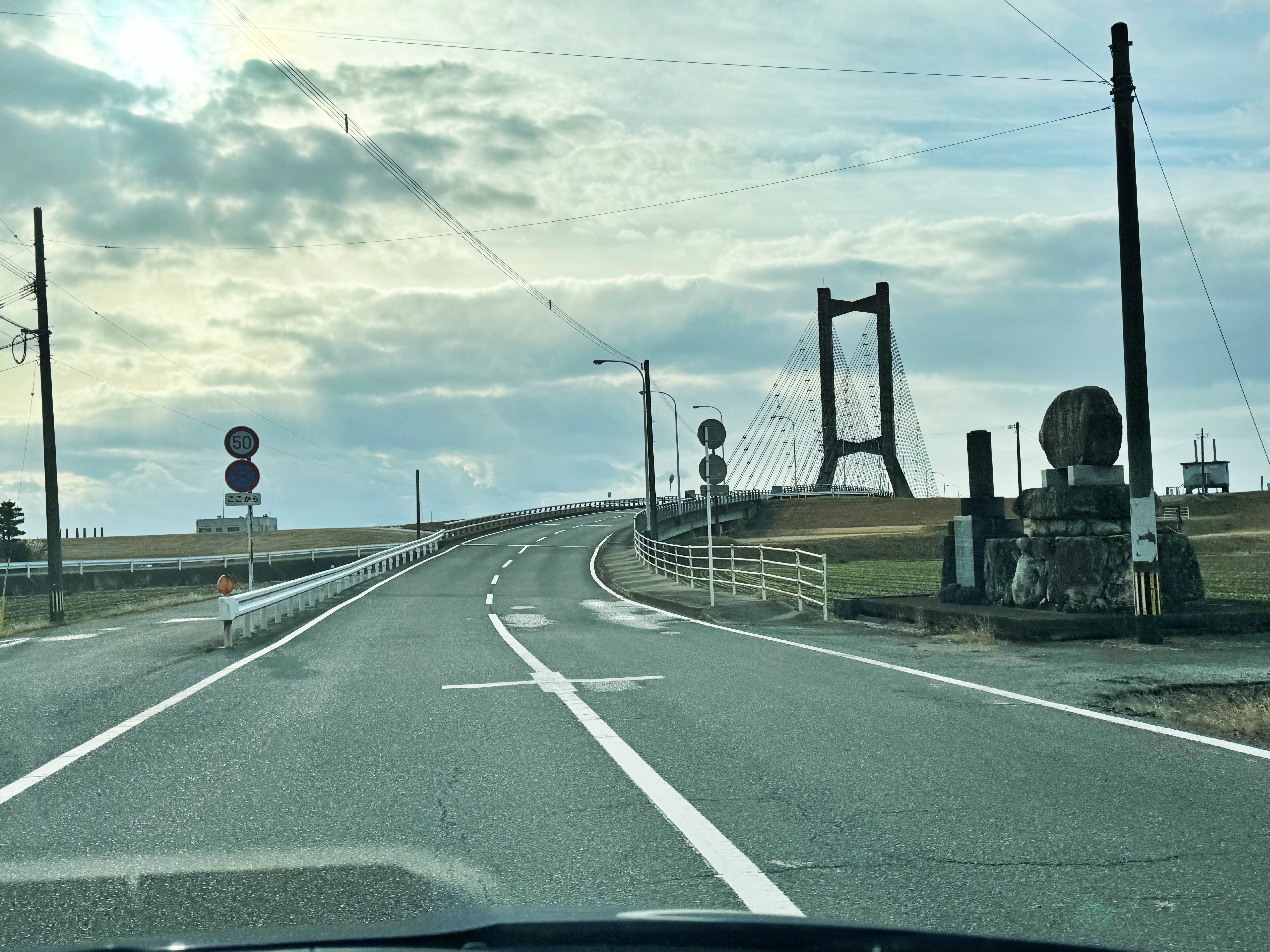 다리 우측의 비석은 이 지역의 경지개량 기념비랍니다. 저 다리의 이름은 한국어로 신도대교(新渡大橋) 일어로 읽으면 신와타시오오하시(しんわたしおおはし). 헤이세이 7년. 95년에 개통된 다리라고 하네요. 물론 이 도로는 국도도 현도도 아닙니다만, 키시마군의 고호쿠마치와 시로이시초를 잇는 그냥 군도(郡道) 수준의 다리입니다. 관광지도 아니고 잘 알려지지도 않았습니다만, 후기를 보니 주변 배경이 멋지다고 하네요. 그렇게 시로이시초(白石町)에 진입했습니다.