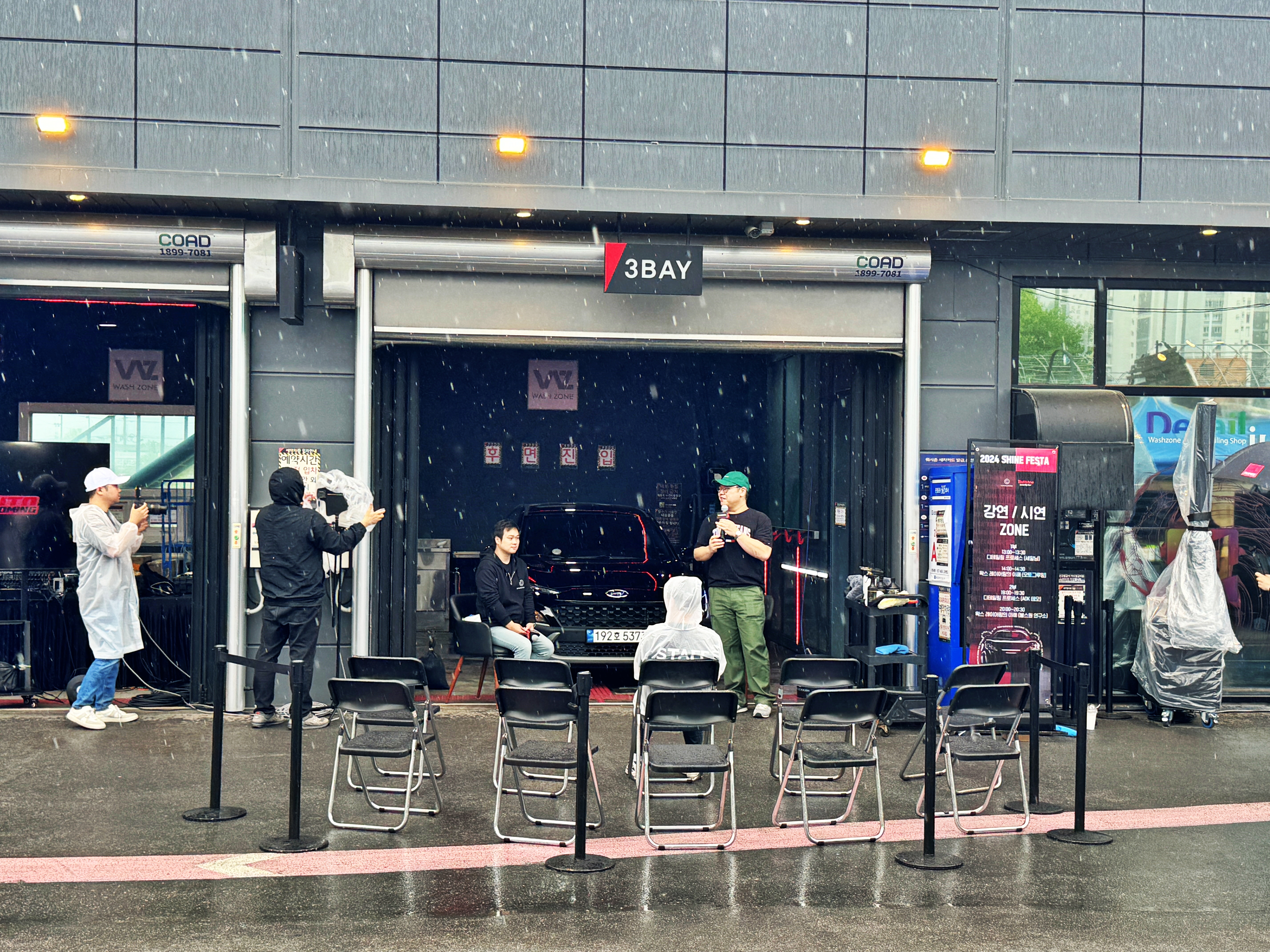 세차 유튜버 세알남, 오토그루밍, ADK 테오를 비롯하여 불스원 연구소 직원분까지 강연을 준비했습니다만, 비가 내려 일부 강연은 취소되었고 1부의 오토그루밍 강연은 예정되로 진행되었으나 스텝분들만 우비를 쓰고 앉아 계시네요. 다들 저 멀리 불스원 부스로 피신해서 강연을 듣고 있습니다. 날만 좋았더라면 더 좋았을텐데 아쉬웠습니다.
