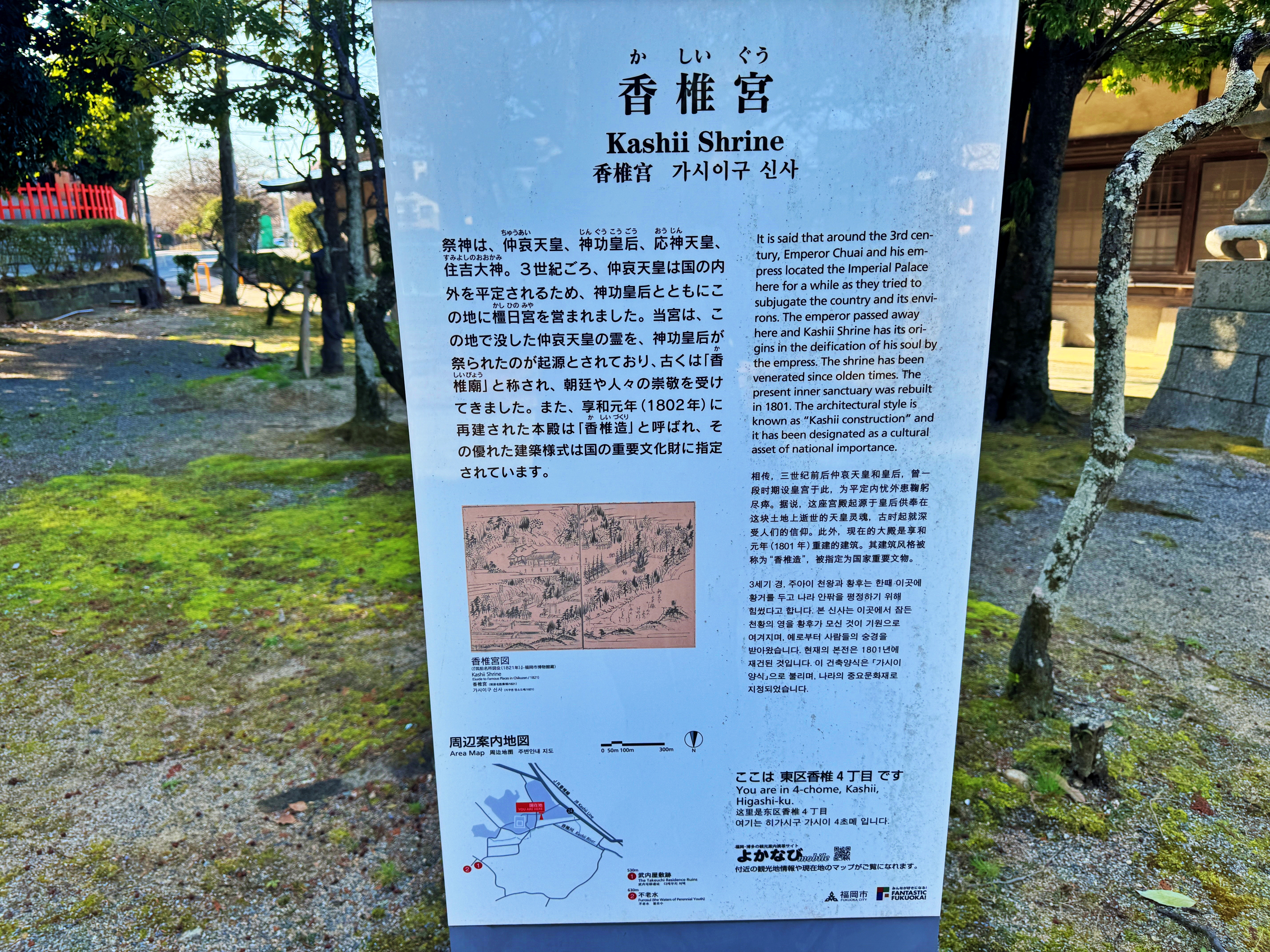 149년생인 주아이 천황을 기리는 신사가 2000년 가까이 세월이 흐른 지금까지도 운영되고 있습니다. 물론 현재 건축물은 1801년에 재건했다고 합니다만, 그로부터도 220년 이상 흘렀습니다.