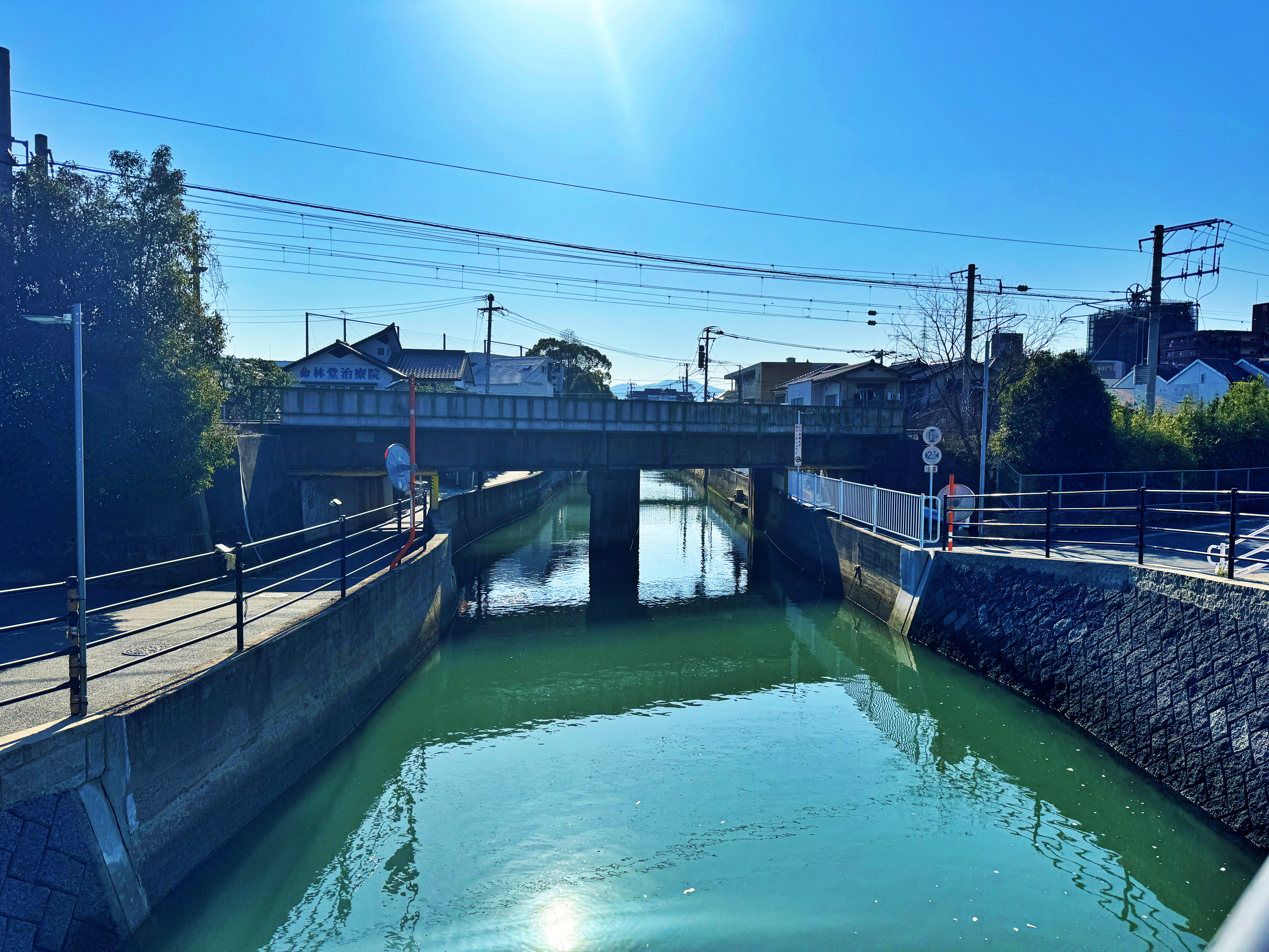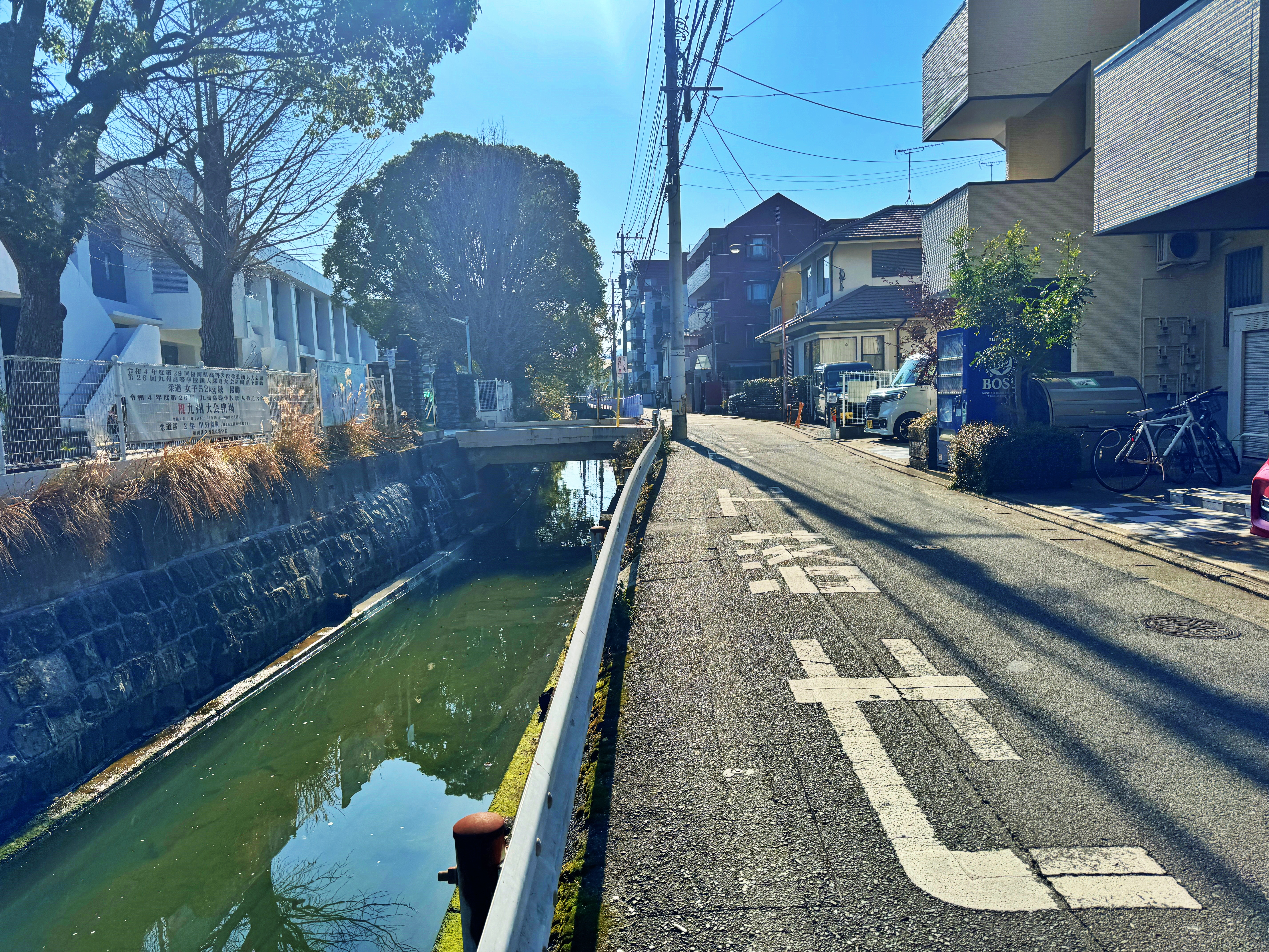 구글맵에서 최단거리를 찍으니 철길 아래를 통과하여 주택가를 거치라 하네요. 도랑을 흘러 하카타만으로 나가는 물이 썩 깨끗하지는 않습니다만, 전형적인 일본 주택가 감성을 보여주고 있습니다.