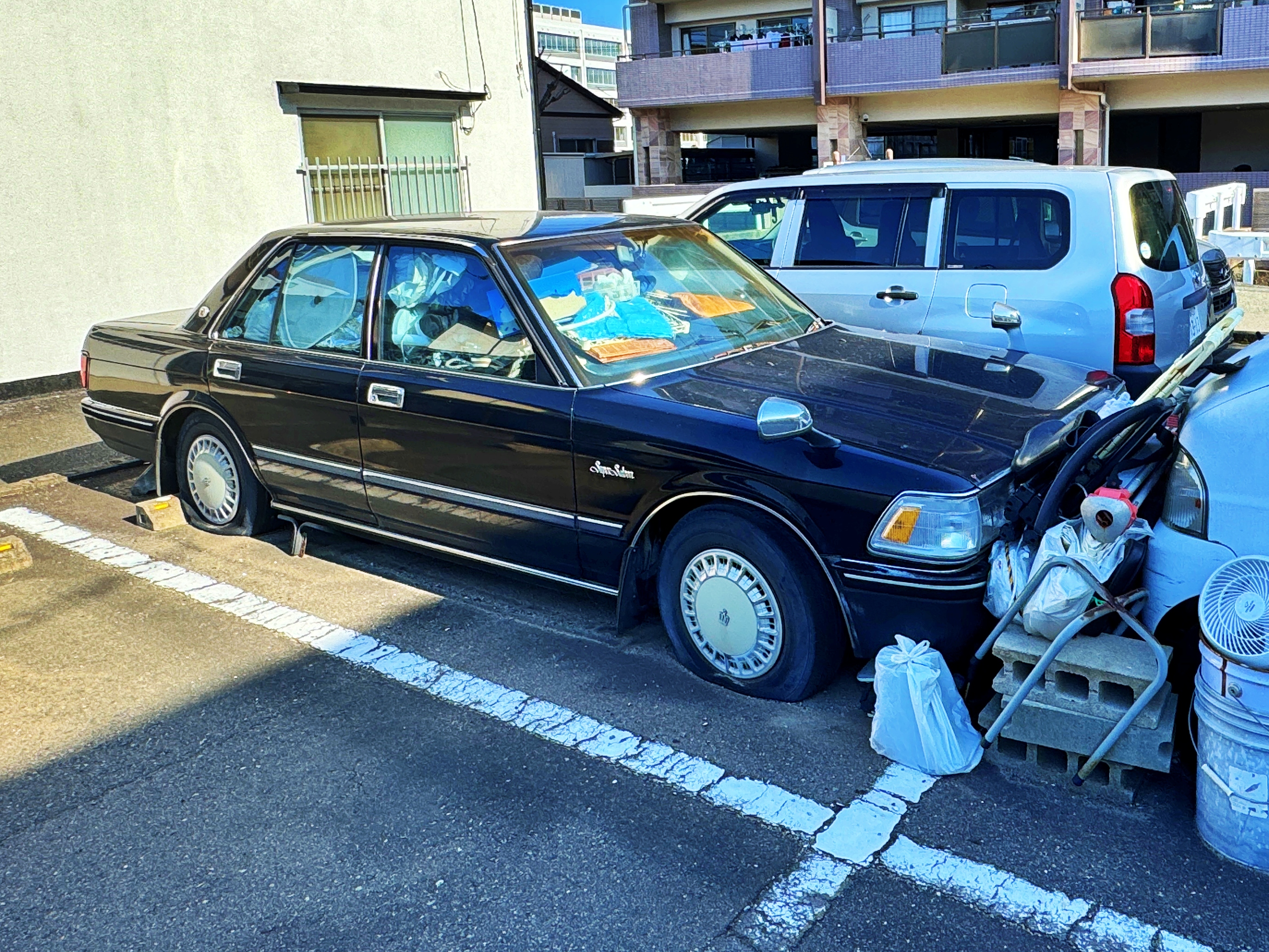 좌측 검정 세단은 8세대 크라운 슈퍼살롱. 우측 미니밴은 9세대 다이하츠 하이젯트네요. 어느 나라나 방치차는 존재하나 봅니다. 무슨 이유에서 쓰레기가 가득 담긴채로 주택가에 방치되어 있는지는 몰라도 주택가 주차장에 꽤 오랜 세월 방치된듯 보입니다.