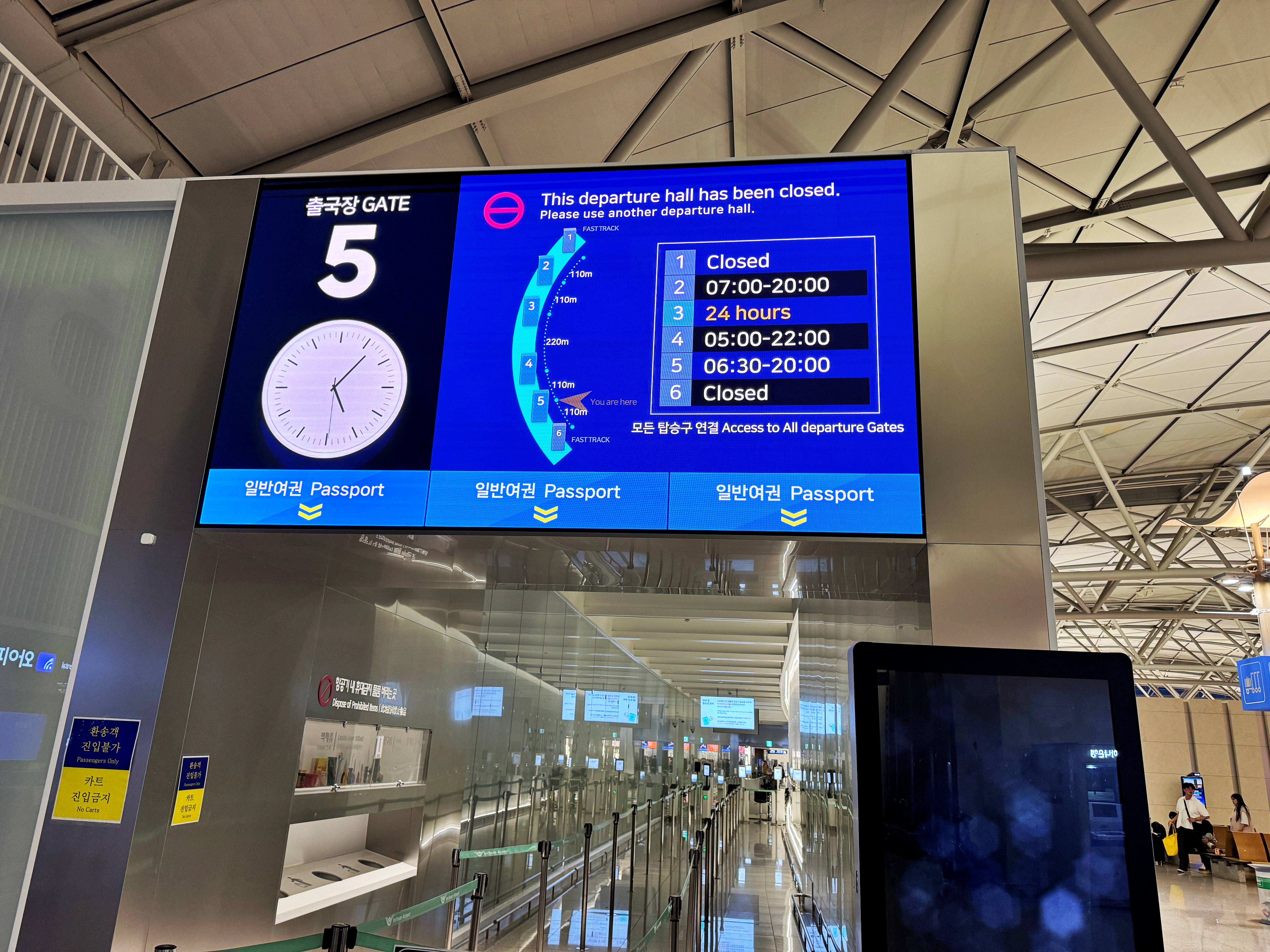 3번 게이트만 24시간 운영되고 있으며, 나머지 게이트는 시간대에 따라 유동적으로 운영됩니다. 성수기나 연휴라면 1번과 6번 게이트도 열어주겠죠.