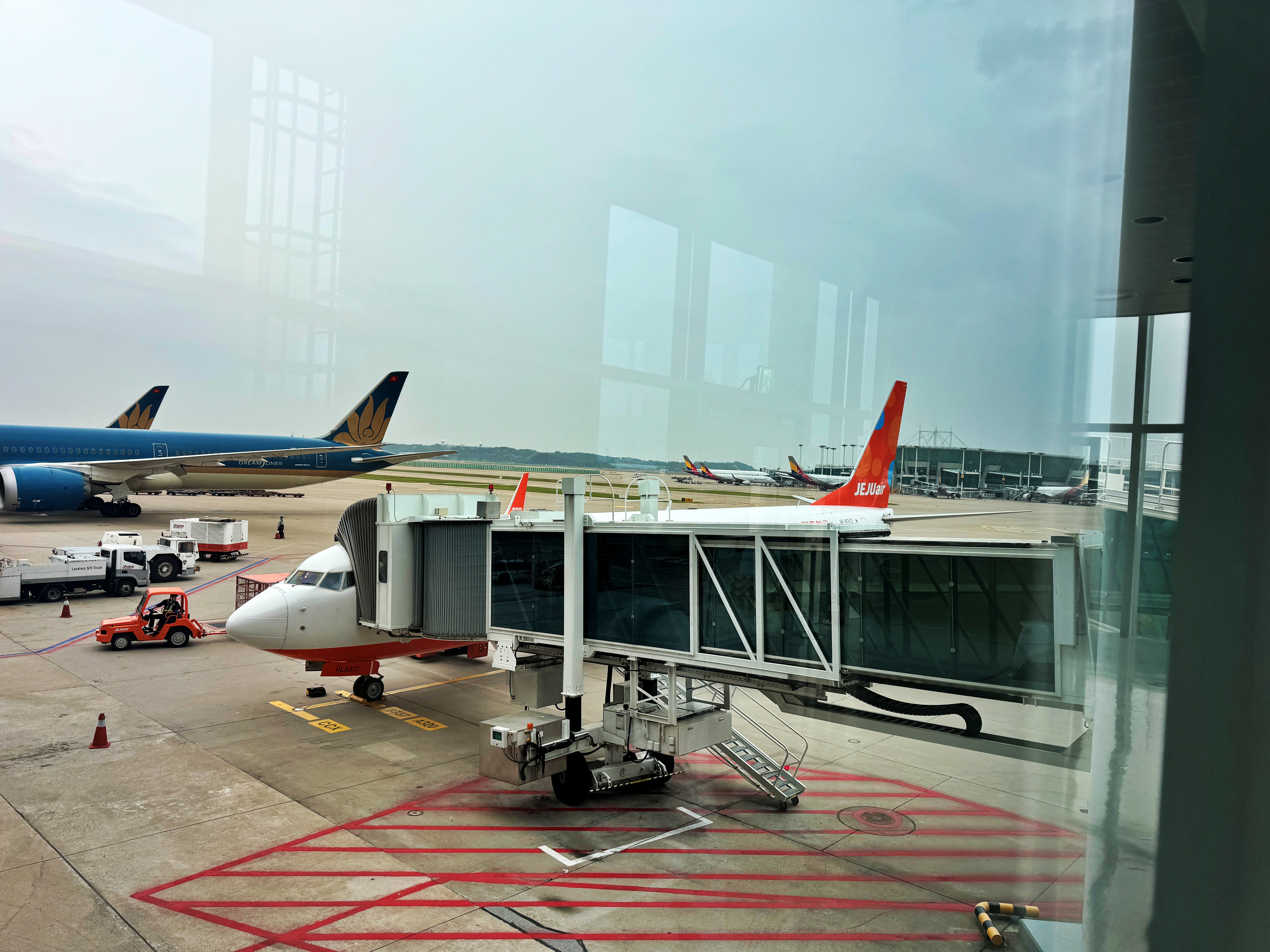 감귤항공 여객기는 인천공항 1 터미널 탑승동을 빠져나와 히로시마로 향합니다.