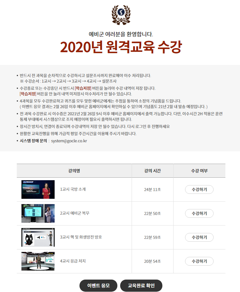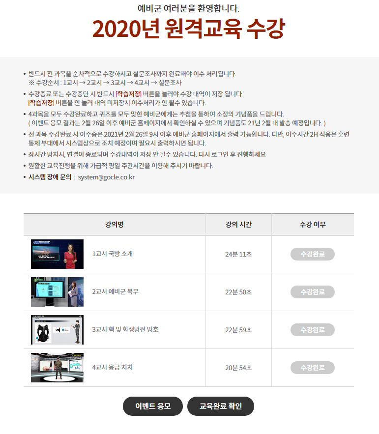 2020년 예비군훈련 원격교육을 완료하였습니다.