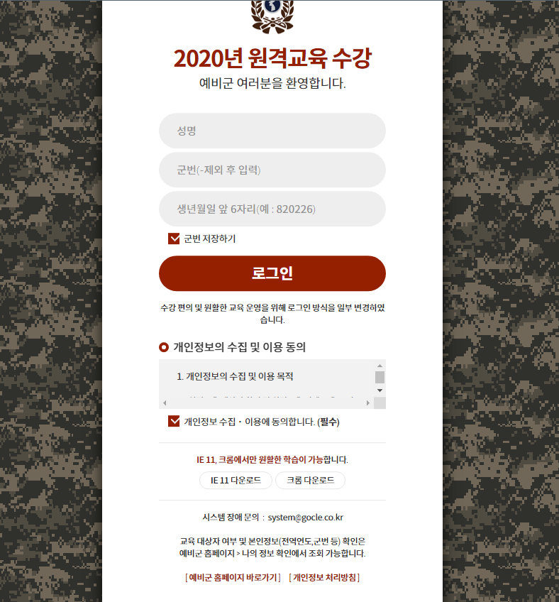 로그인 방식이 일부 변경되었다고 하네요. 그동안 만들었던 아이디와 관계없이 성명과 군번 생년월일을 입력한 다음 개인정보의 수집 및 이용에 동의한 뒤 로그인 버튼을 눌러주시면 됩니다. 진작 이렇게 하면 될 일을 뭐하러 어렵게 회원가입 후 로그인을 하도록 만들었는지는 모르겠습니다.