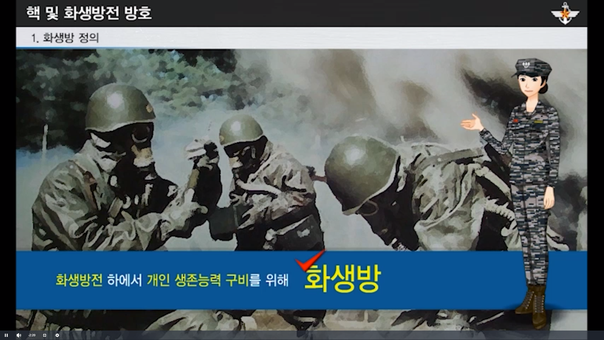핵 및 화생방과 관련된 내용을 다루고 있습니다. 방독면 관련 얘기도 나오고요. 듣기 거북한 TTS 음성과 움직임이 매우 부자연스러운 플래쉬 애니메이션으로 제작된 해병대 대위가 나타납니다. 이 역시 2교시와 마찬가지로 영상 중간에 퀴즈가 삽입되어 있습니다.