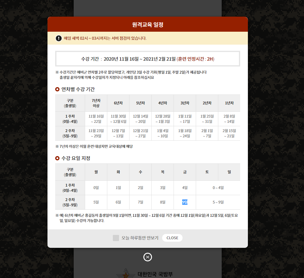 네. 이수를 마쳤습니다. 생년월일 끝자리에 따라 수강 가능일자가 정해지고, 토요일과 일요일은 생일과 관계없이 모두 수강이 가능하다고 합니다. 천상 내년에도 코로나19 종식은 불가피하다 여겨지기에 원격교육으로 대체될 확률이 높아보입니다만, 일단 뭐 내년에 어찌 흘러갈지 모르니 여유가 있으실 때 원격교육을 수강하시는건 어떠실지요. 그렇게 2020년 5년차 예비군 교육을 마쳤습니다.