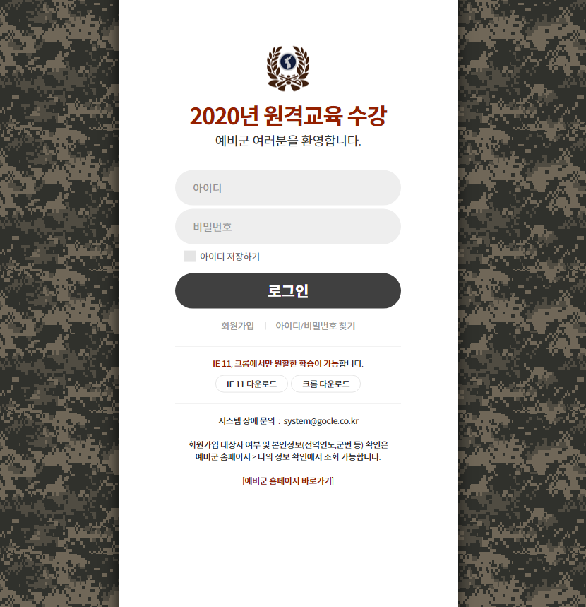 2020년 예비군 훈련은 취소 및 이수처리되었습니다. 그리고 지난번에 문자가 와 미리 예비군 원격교육 홈페이지에 가입을 했었는데, 그새 로그인 방식이 변경되었더군요. 괜히 가입했습니다. 여튼 남들은 모텔가서 놀고있는 25일 크리스마스에 예비군 원격교육 수강일이라는 문자가 왔더군요.