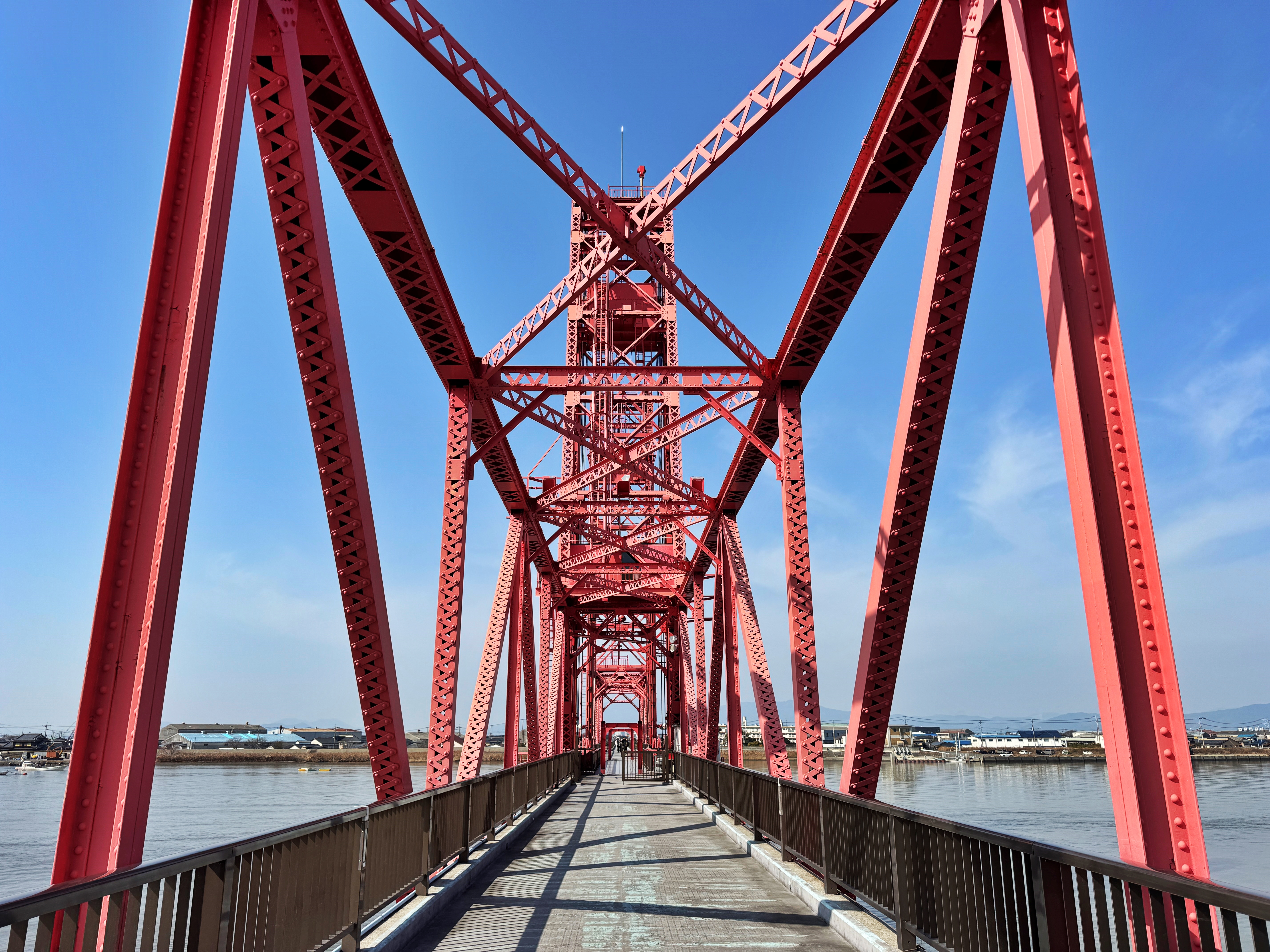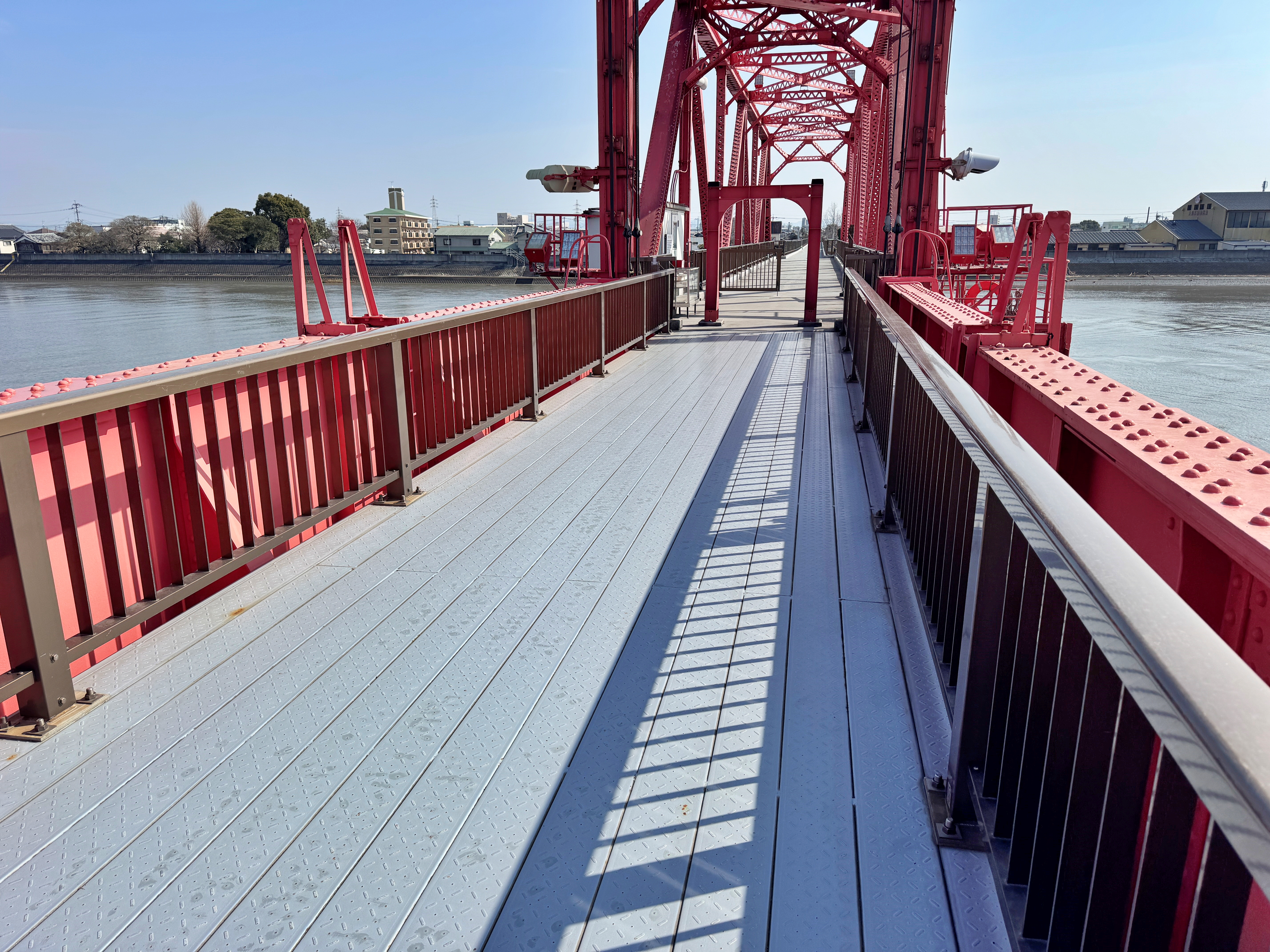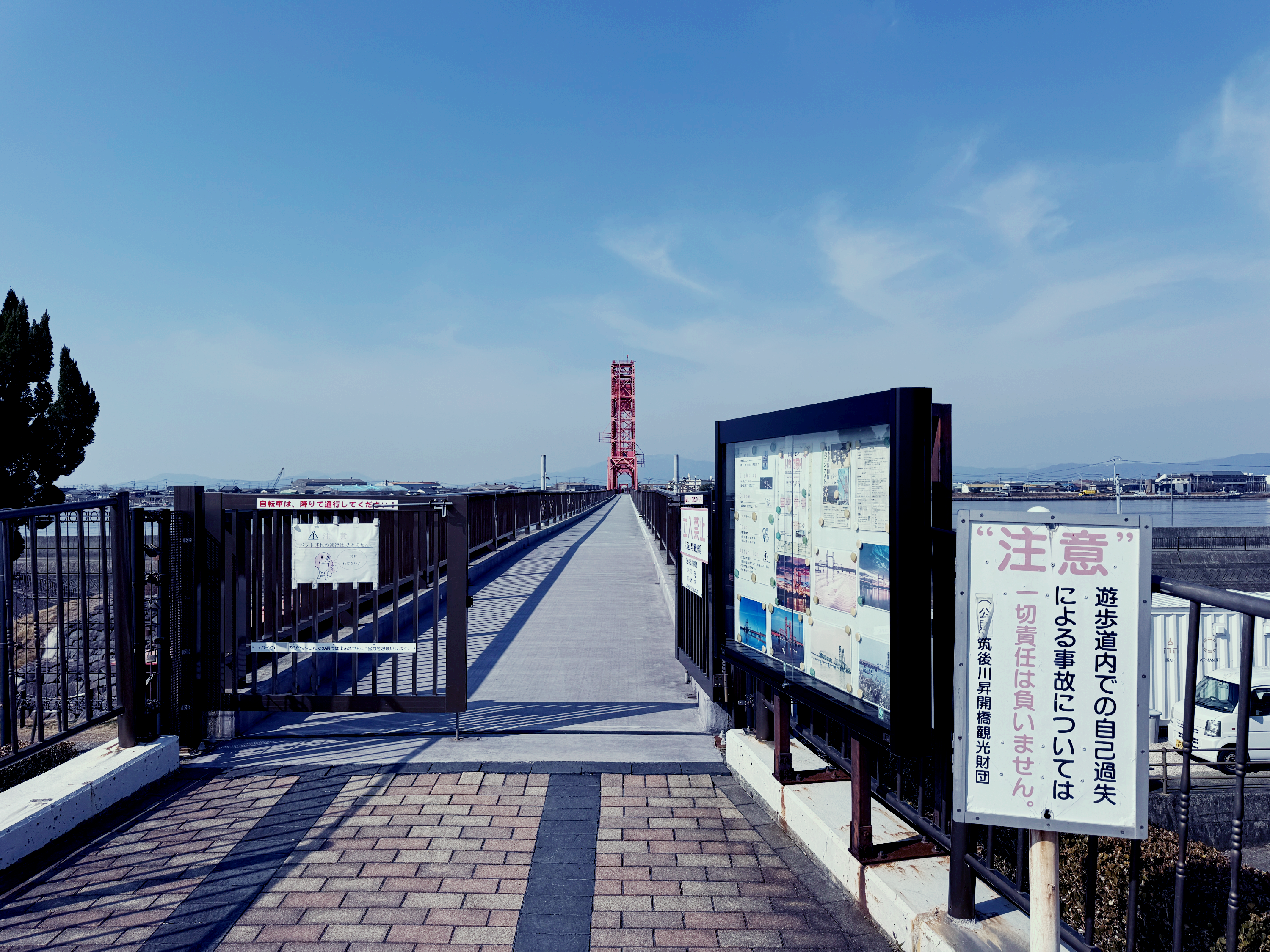 오래된 건물이 보이던 사거리를 거쳐 치쿠고강 승개교 전망공원(筑後川昇開橋展望公園)에 왔습니다. 말 그대로 다리 상판이 위 아래로 승강기처럼 올라가고 내려가는 그런 다리입니다. 비록 사가선 철도는 1987년 폐선되고 사라졌지만 그 자리에 남아있는 치쿠고강을 횡단하는 이 승개교는 1996년 주변의 공원화와 함께 횡단 할 수 있는 산책로가 개통되었고 2003년에 일본의 국가 지정 중요 문화재, 2007년에는 기계유산으로 인정되며 현재에 이르고 있다고 합니다.