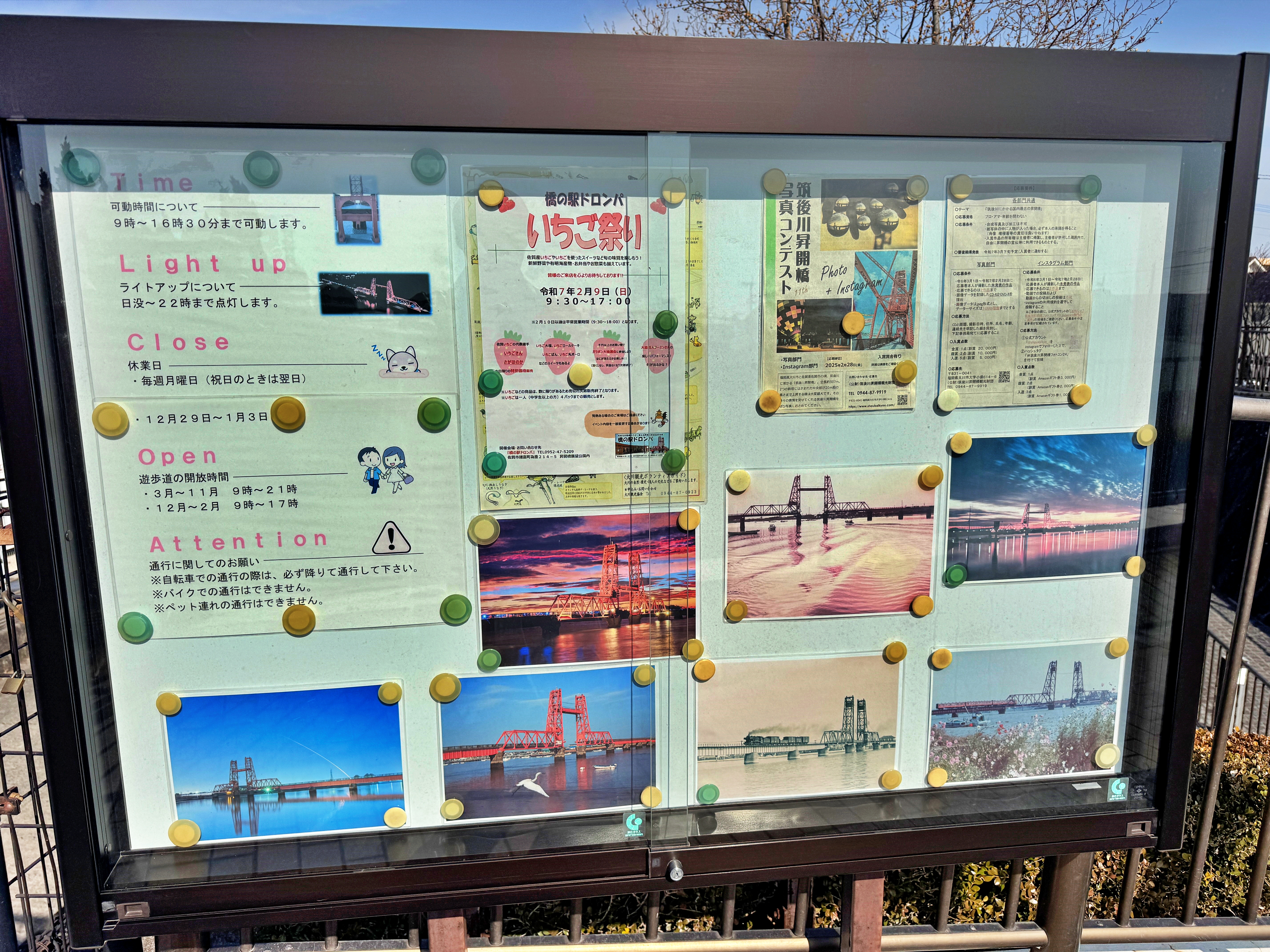 오래된 건물이 보이던 사거리를 거쳐 치쿠고강 승개교 전망공원(筑後川昇開橋展望公園)에 왔습니다. 말 그대로 다리 상판이 위 아래로 승강기처럼 올라가고 내려가는 그런 다리입니다. 비록 사가선 철도는 1987년 폐선되고 사라졌지만 그 자리에 남아있는 치쿠고강을 횡단하는 이 승개교는 1996년 주변의 공원화와 함께 횡단 할 수 있는 산책로가 개통되었고 2003년에 일본의 국가 지정 중요 문화재, 2007년에는 기계유산으로 인정되며 현재에 이르고 있다고 합니다.