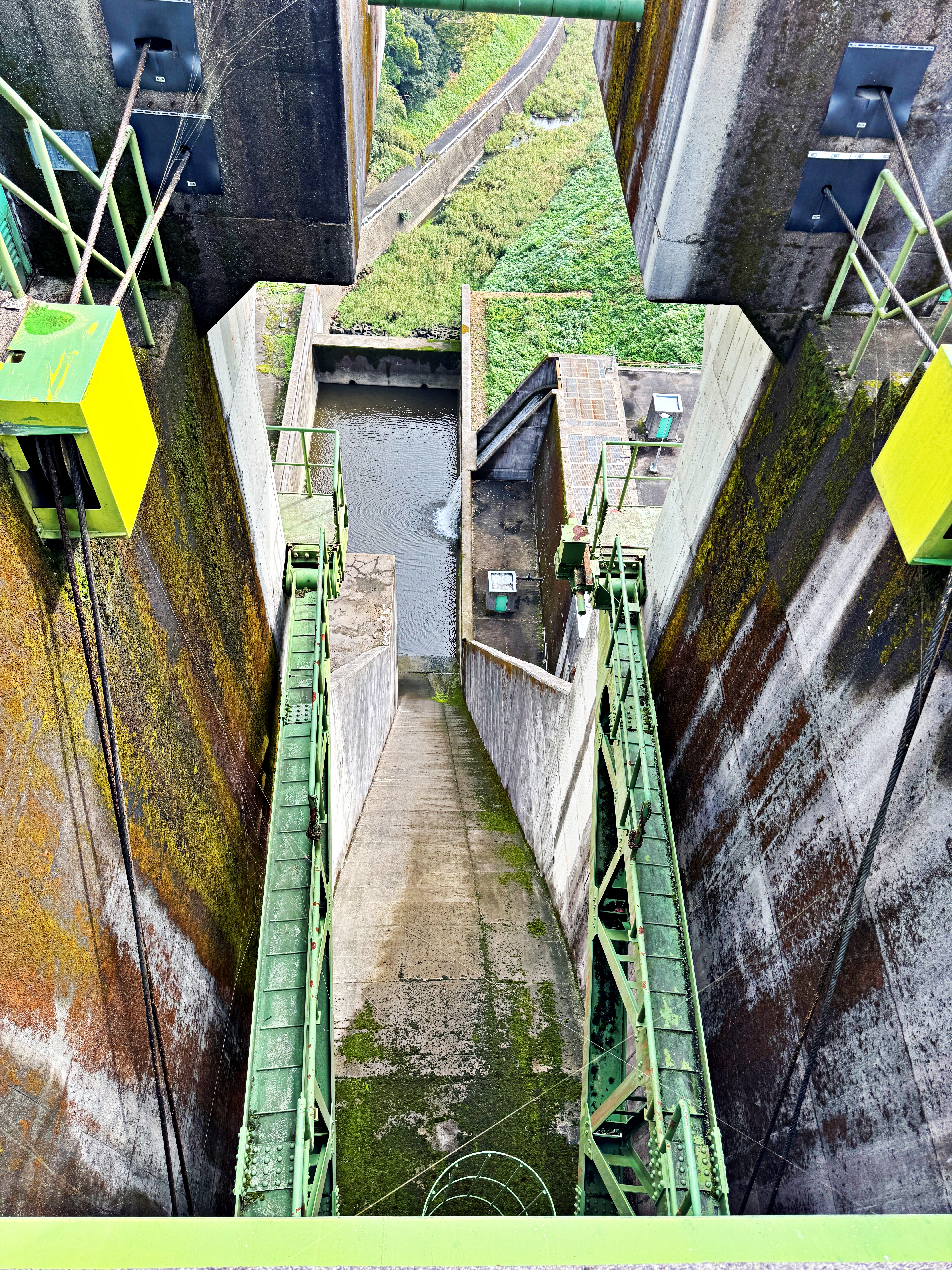 수문은 도르레와 철제 와이어로 움직이는듯 보이네요. 수로에는 이끼가 잔뜩 끼어있습니다. 그렇게 댐의 수문을 건너 반대편으로 넘어왔네요.
