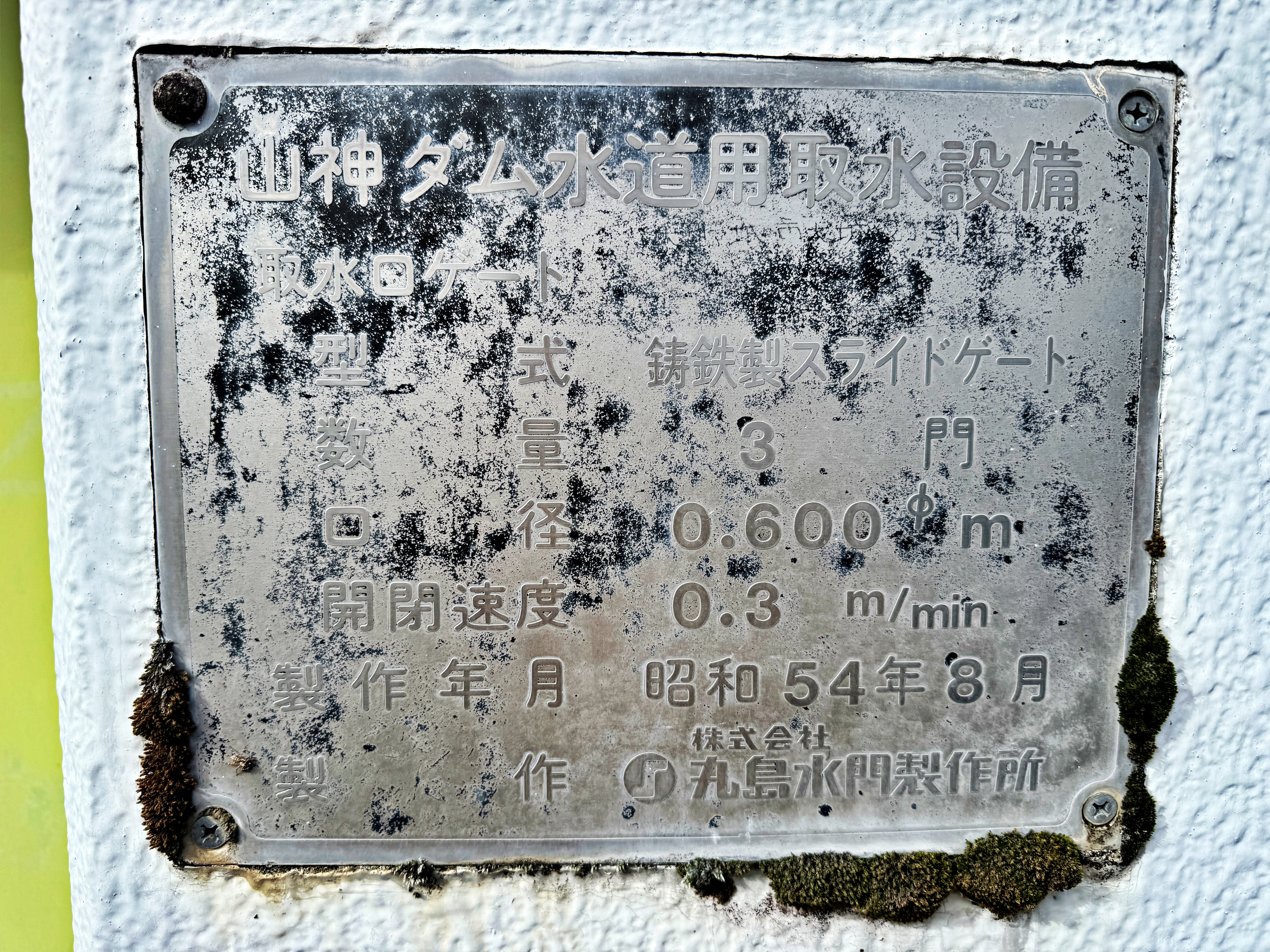 주철제 슬라이드 게이트를 열어 취수한다고 하네요. 쇼와 54년 8월에 제작되었고, 주식회사 마루시마 수문제작소에서 제작했다고 합니다.