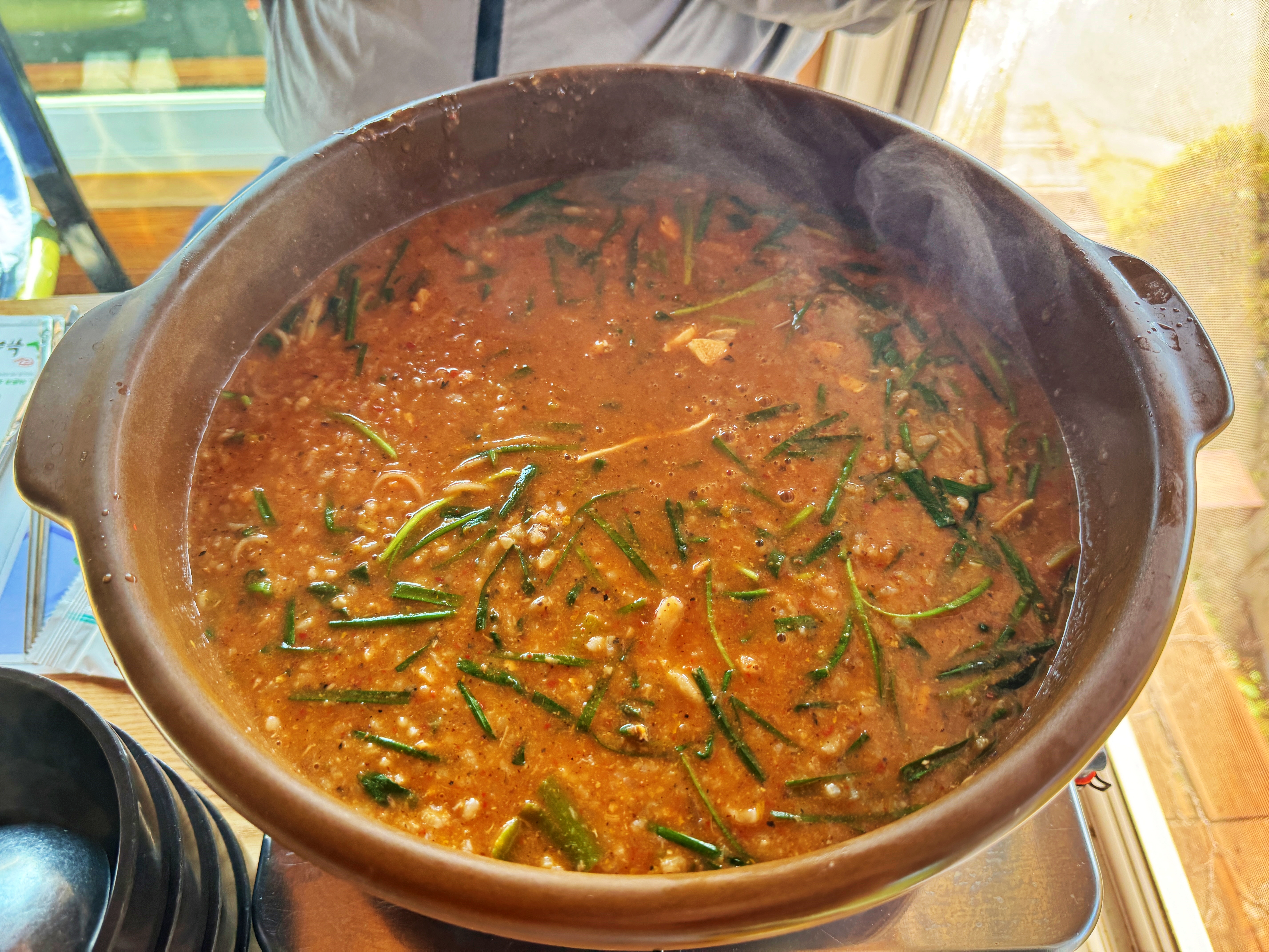 배 터지도록 먹고 피곤했던 저는 먼저 잤습니다만, 남은 분들은 밤에 또 볶음밥을 만들어 드셨다고 하네요. 그렇게 아침까지 자고 식당 영업시간 전에 어죽을 준비해준다고 하셔서 아침 겸 점심으로 어죽을 먹었습니다.