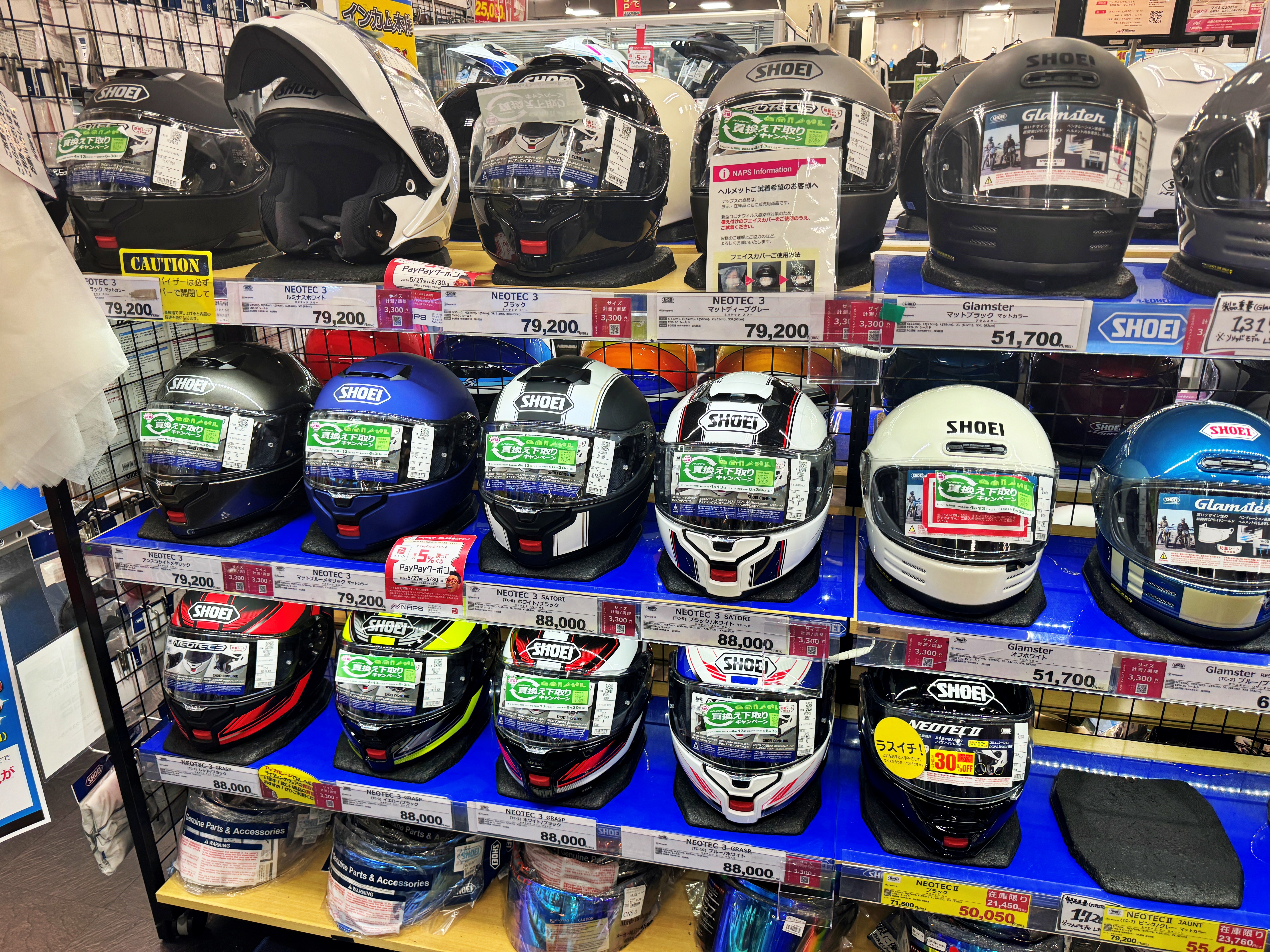 저 같은 바알못이 아는 헬멧이라곤 아라이 쇼에이가 전부입니다만, 정말 다양한 브랜드에 다양한 디자인을 가진 헬멧이 많았습니다. 한국에서 구입하는 것보다 일본에서 구입하는 것이 약 20만 원 정도 저렴하다고 합니다. 엔저의 영향을 제외하고도 저렴한데 요즘 엔화약세가 엄청나다 보니 사실상 헬멧만 하나 사 와도 비행기 티켓값에 여행경비는 벌어오는 수준이라고 하더군요.