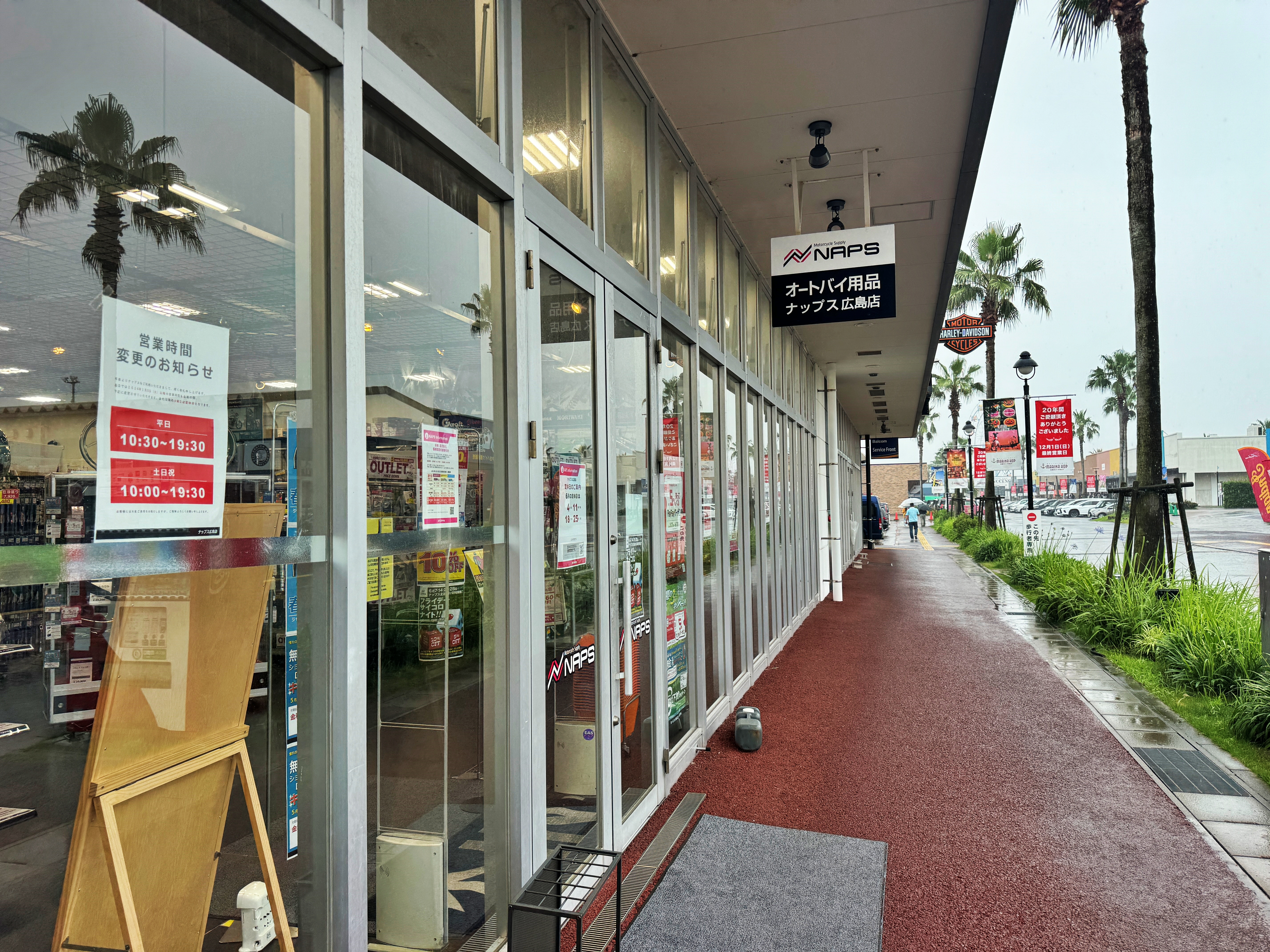 가타가나와 한자로 '오토바이용품 나푸스 히로시마점(オートバイ用品 ナップス広島店)'라고 적혀있습니다.