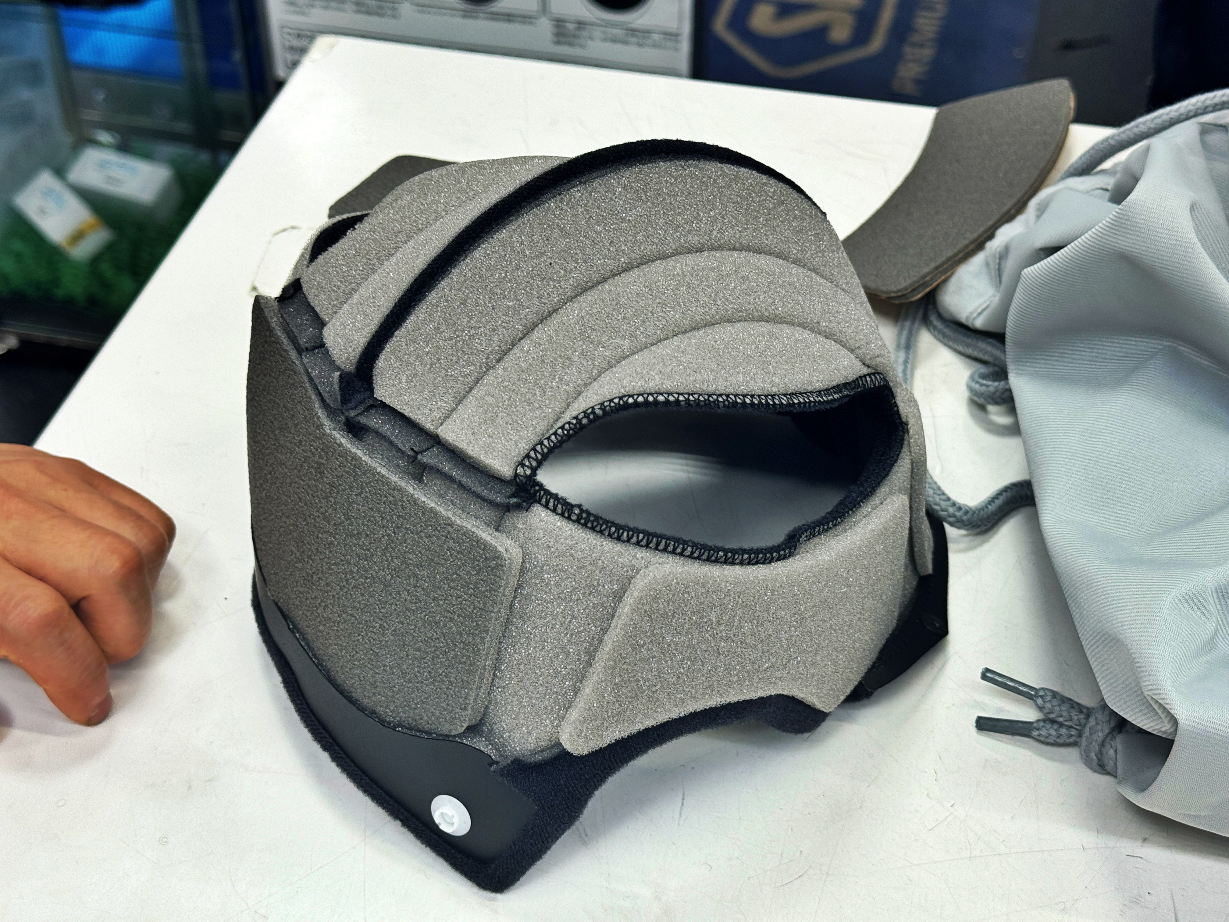 측정된 사이즈에 맞춰 헬멧의 내피를 조정하고 있습니다.