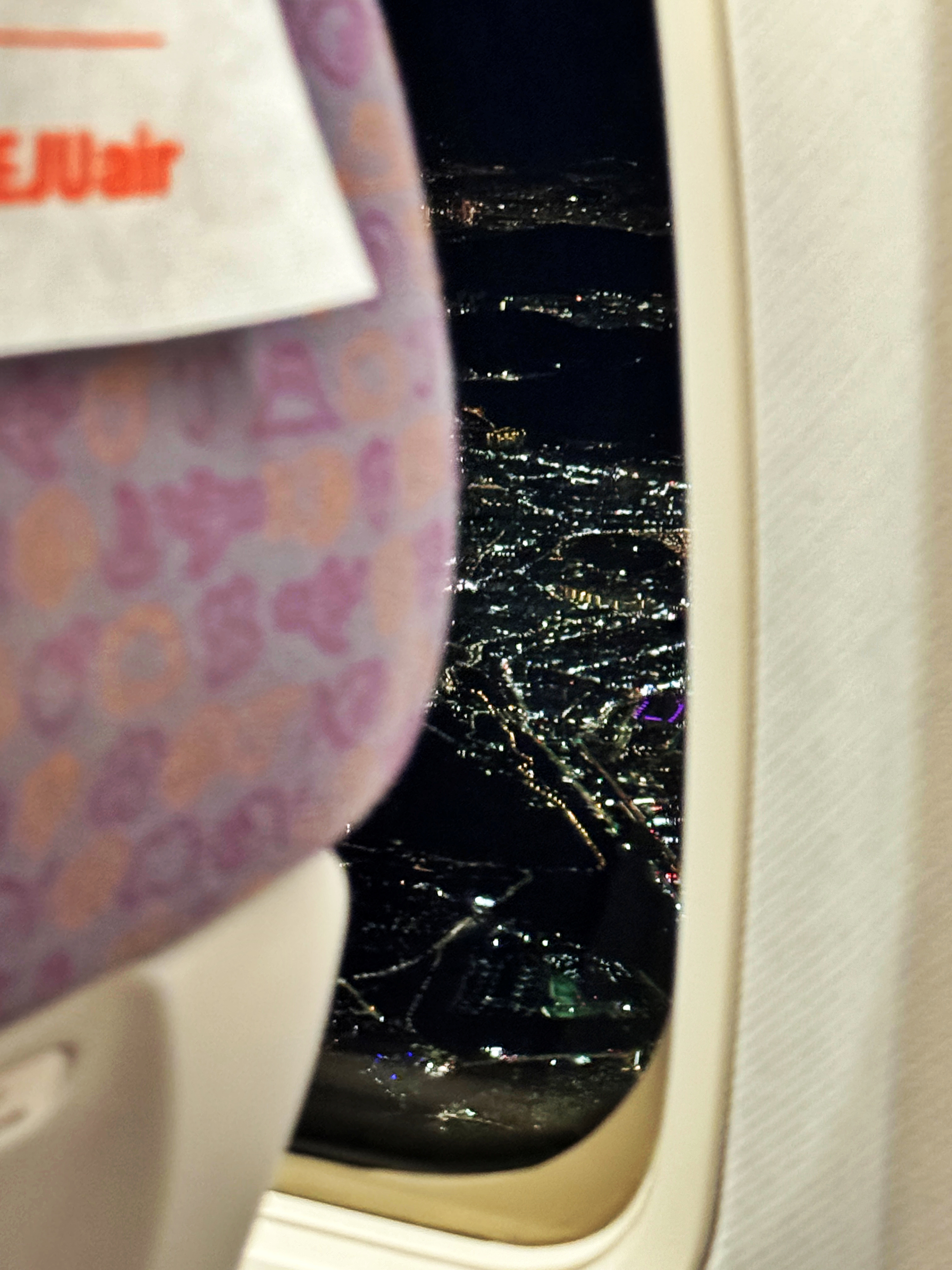 확실히 인천보다 거리가 조금 가까워 체감상 훨씬 빨리 도착하네요. 그래봐야 인천대비 운행시간이 10~20분 정도 덜 걸리는 수준이지만요. 후쿠오카에서 인천으로 돌아올 때 항상 청주공항이 보일 때쯤 도착 안내방송이 나오는데, 대충 도착 안내방송이 나올 즈음의 거리가 줄어든다고 생각하면 되겠네요.