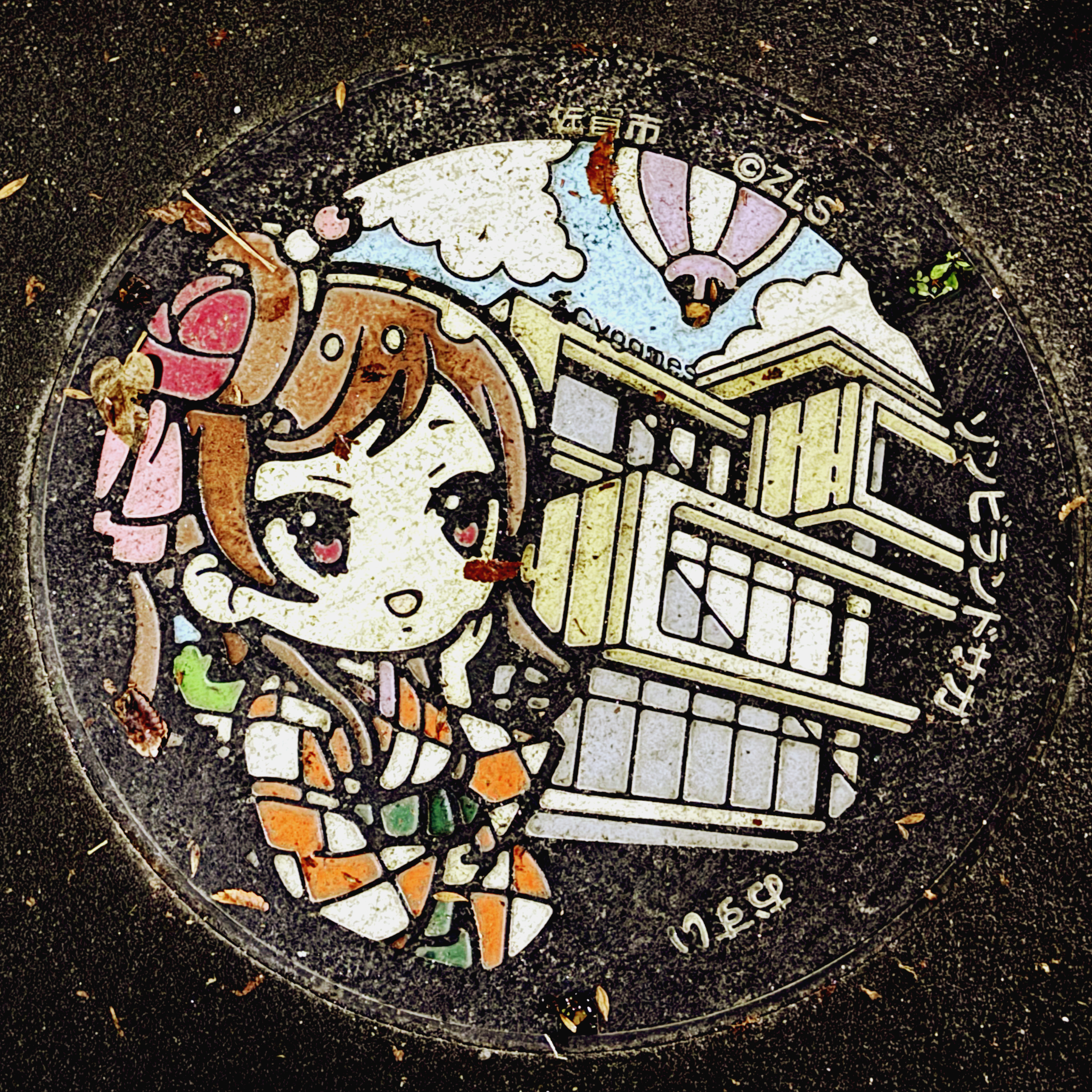 배경은 사가 벌룬 페스티벌의 열기구. 소개에도 그냥 벌룬으로만 적혀있습니다. 실제 행사가 열리는 장소나 벌룬사가역 근처에 설치해 뒀으면 좋을 법 하지만 사가시 시내 한복판에 설치했는지는 알 수 없습니다. 역시 오수가 지나는 실제 사용 중인 맨홀이네요.
