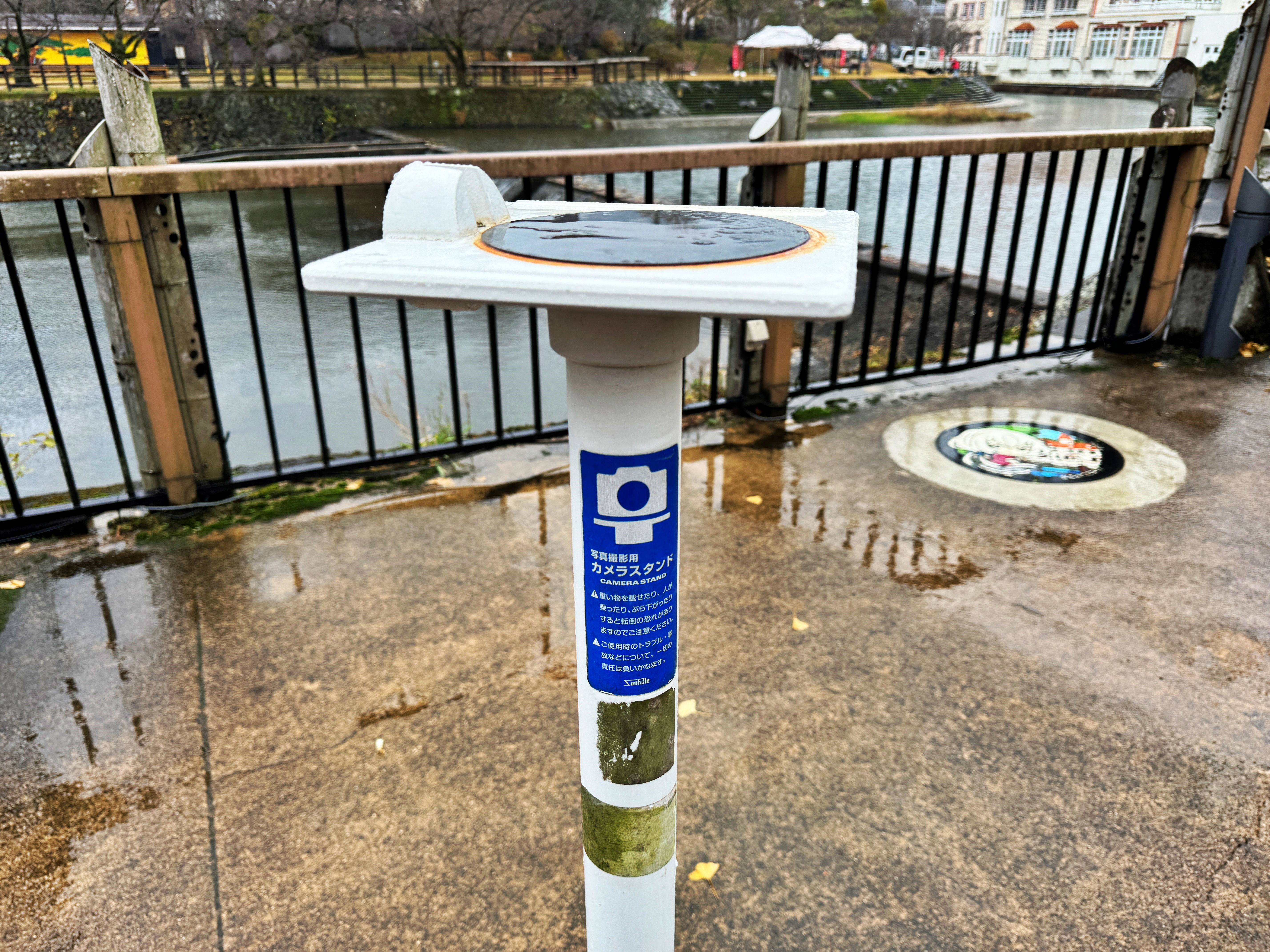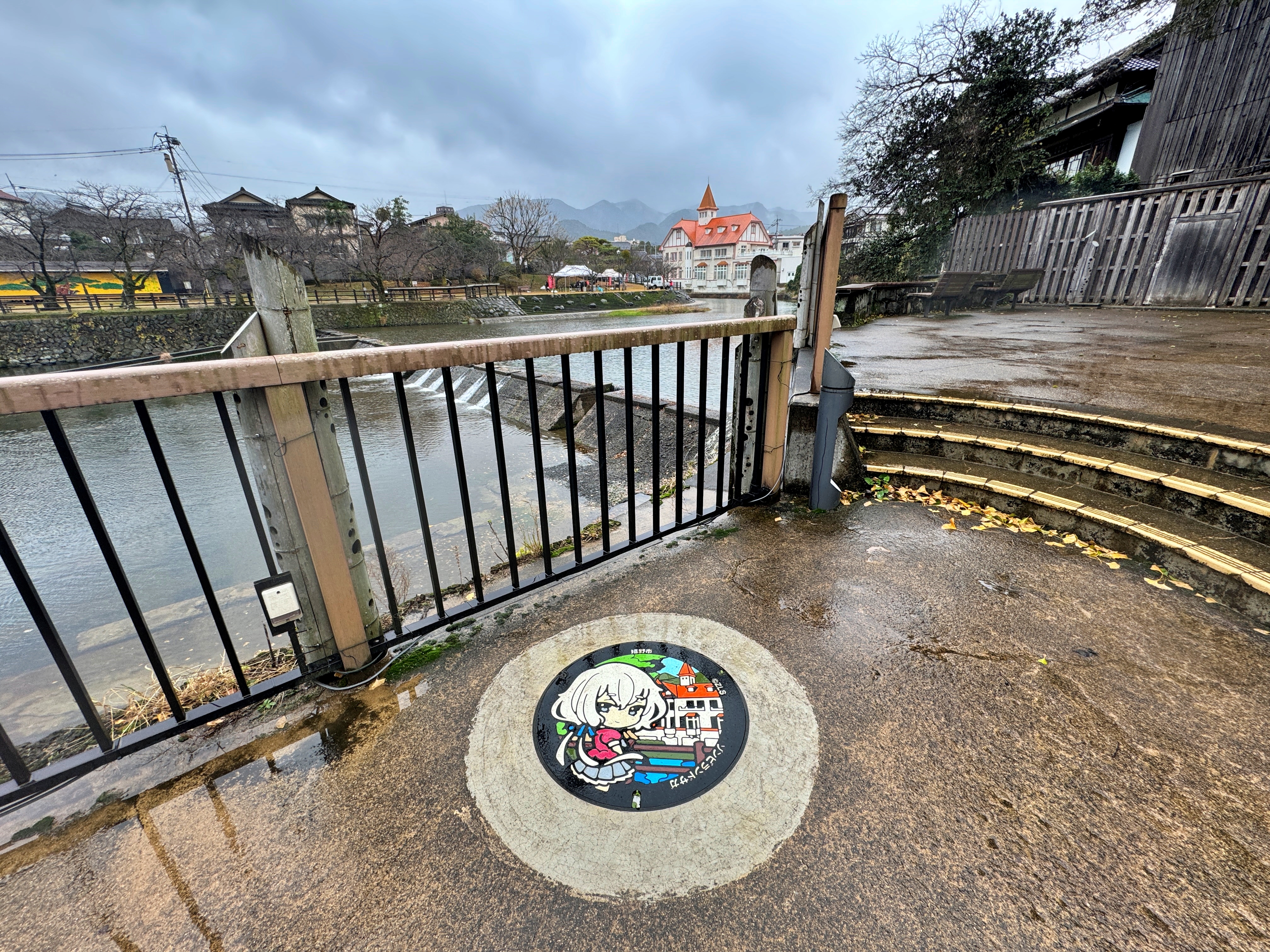 우레시노강을 끼고 붙어있는 건물들만 바라보고 있어도 그냥 힐링 그 자체입니다. 토요일인지라 무슨 행사가 있는지 공무원 아저씨들이 오셔서 텐트를 설치하고 계시네요. 상당히 복잡합니다. 그렇게 이 공원의 보행자 통로를 쭉 따라가다 보면 그림이 그려진 맨홀이 있습니다.