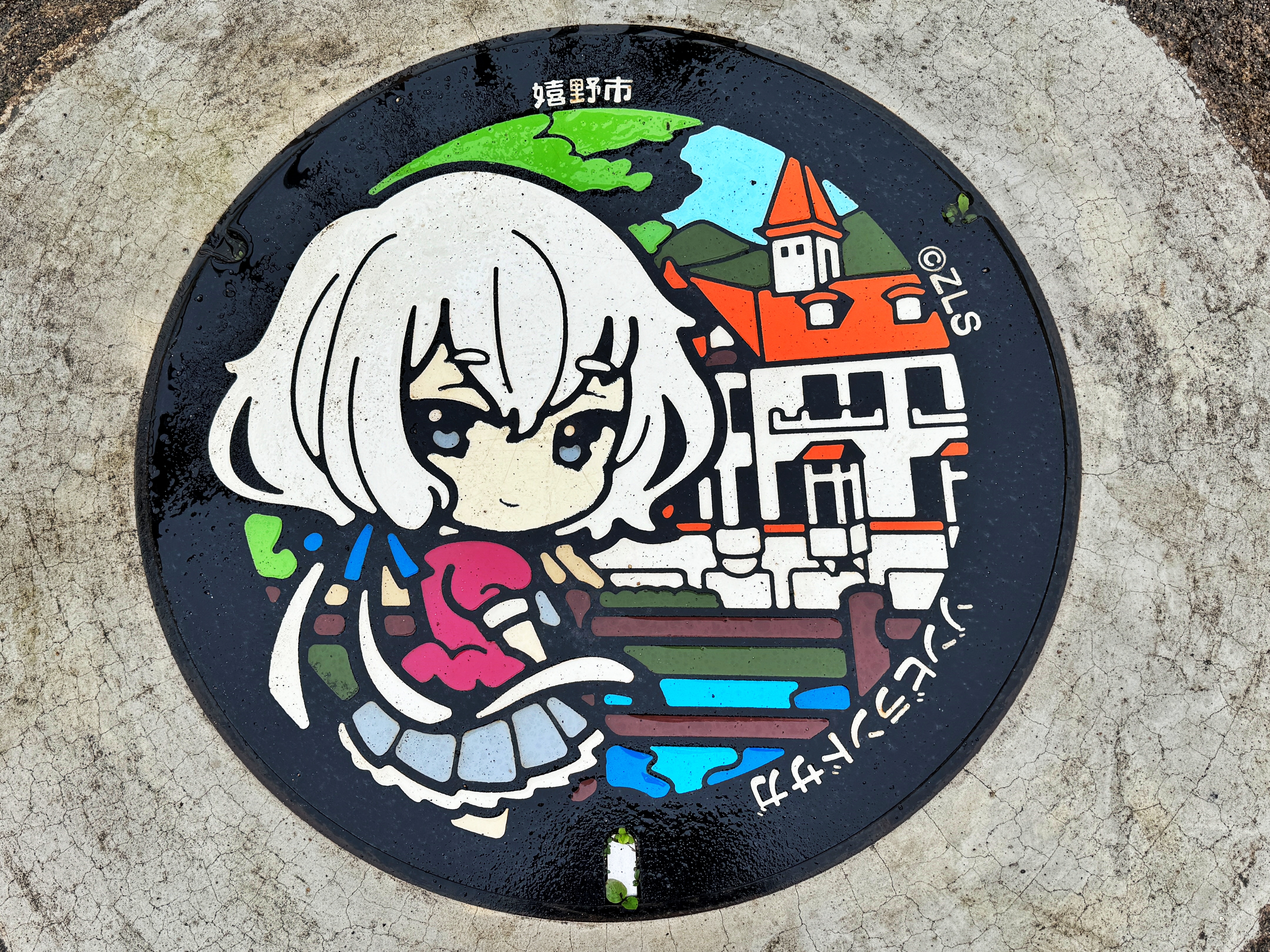 주택가 골목에서도 사람 하나 지나다닐만한 작은 골목으로 들어가야 나오는 광장에 소재한 맨홀입니다. 담당 캐릭터는 프란슈슈 4호 콘노 준코. 배경은 온천단지의 상징과도 같은 시볼트노유(シーボルトの湯)입니다. 시볼트노유가 잘 보이는 이 광장 울타리에 기대어 넌지시 바라보고 있는 모습이네요. 뒷산 그리고 강 건너편 공원의 녹지까지도 작은 맨홀 안에 모두 구현되어 있습니다. 아 맨홀은 딱히 사용목적이 기재되어있지 않은 모습으로 보아 이 프로젝트를 위해 설치된 가짜입니다.