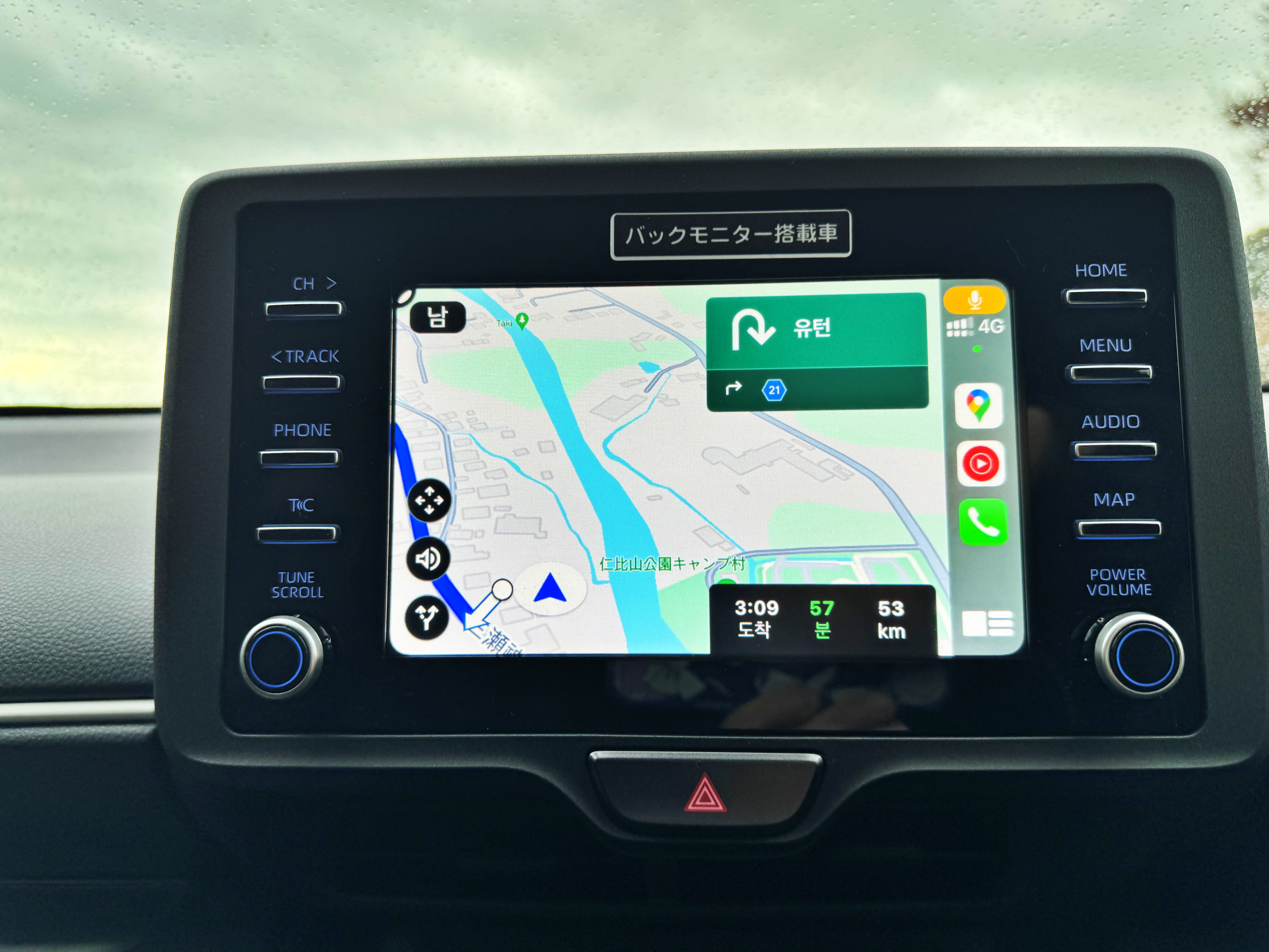 자! 일본에서 렌터카를 대여하실 한국인 관광객 여러분! 토요타 야리스의 순정 AVN은 카플레이와 안드로이드 오토를 지원합니다. 구글맵으로 편하게 다닙시다! 목적지인 텐진 메이도리민까지는 약 53km 떨어져 있네요. 하루 할당량을 모두 돌아봤으니 이제 메이드카페로 갈 차례입니다.