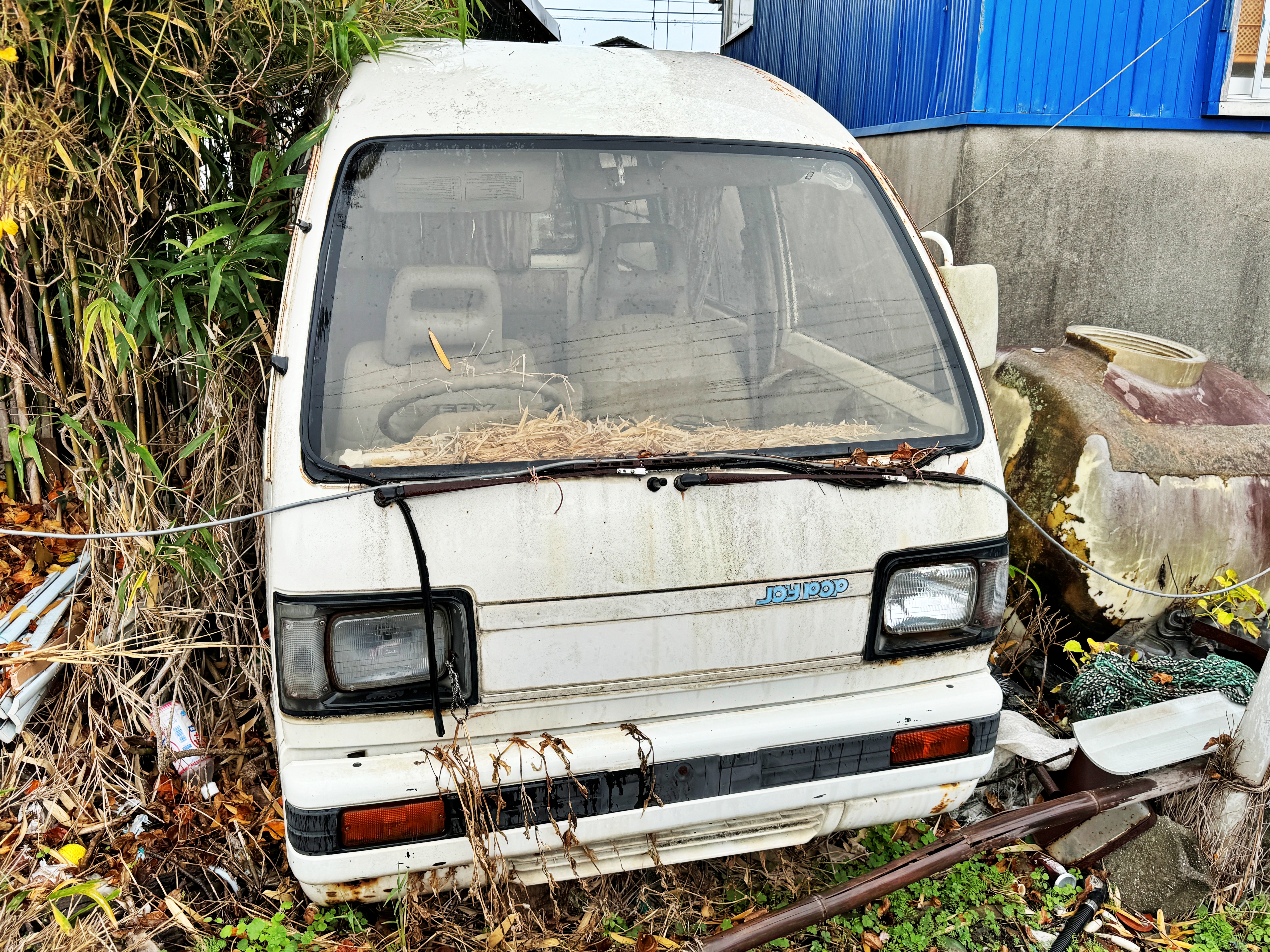 식당 사장님은 이 고양이들의 모습을 보고 있는 제게 '(고양이가) 많네요~'라고 얘기하시더군요. 다시 시동을 걸고 다케자키섬 밖으로 빠져나갑니다. 그리고 다케자키를 빠져나온지 얼마 지나지 않아 오우라의 한 시골집 옆에 버려진 차량을 발견하게 됩니다.