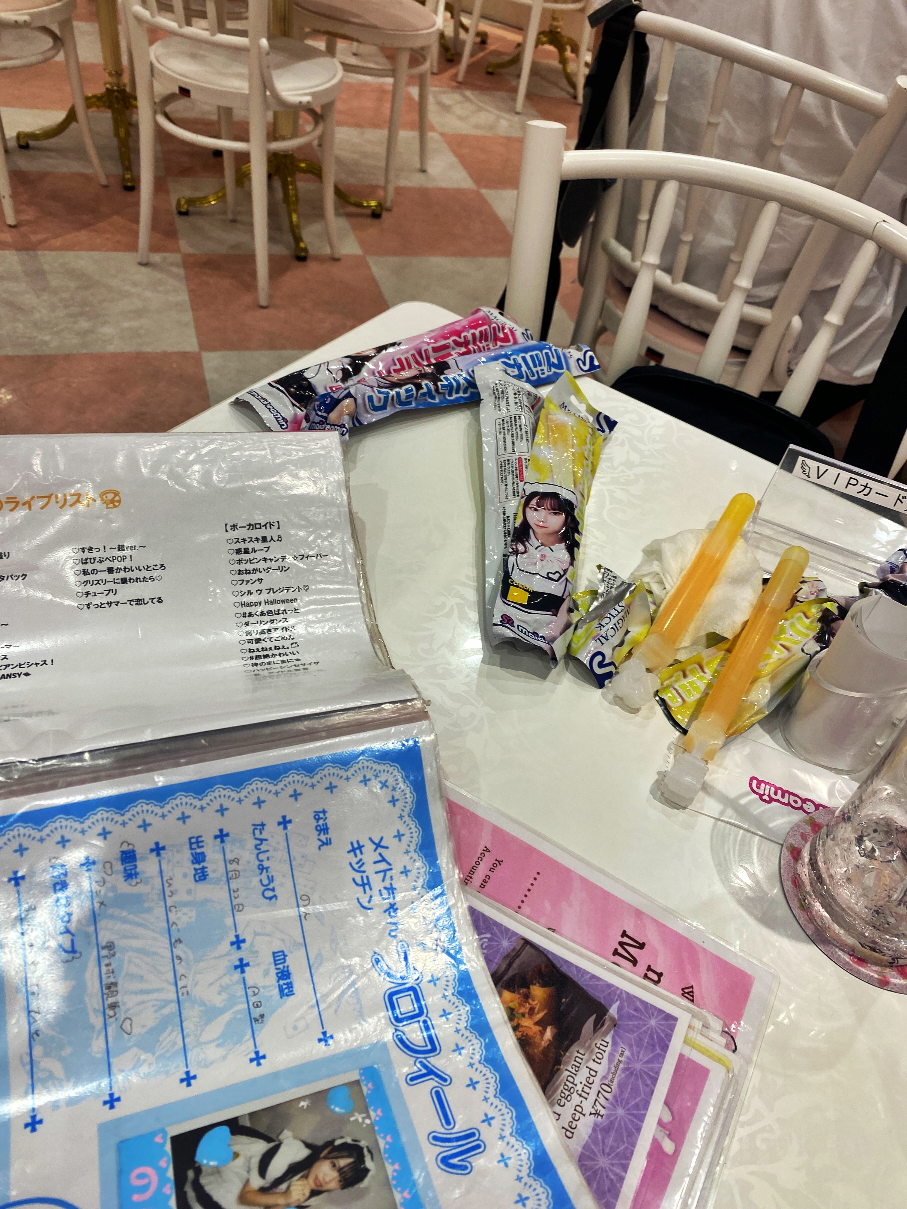 어둠 속에서 빛을 뽐내던 매직스틱도 빛을 다 했습니다. 이대로 그냥 끝내긴 아쉽습니다. 시간을 연장(드림타임)하고 포토와가마마세트 2개와 함께 저녁으로 냉우동을 주문합니다. 그럼 체키 사진은 6장 더 촬영이 가능하고, 매직스틱은 4개를 더 받을 수 있고, 라이브는 두번 더 신청 할 수 있습니다.