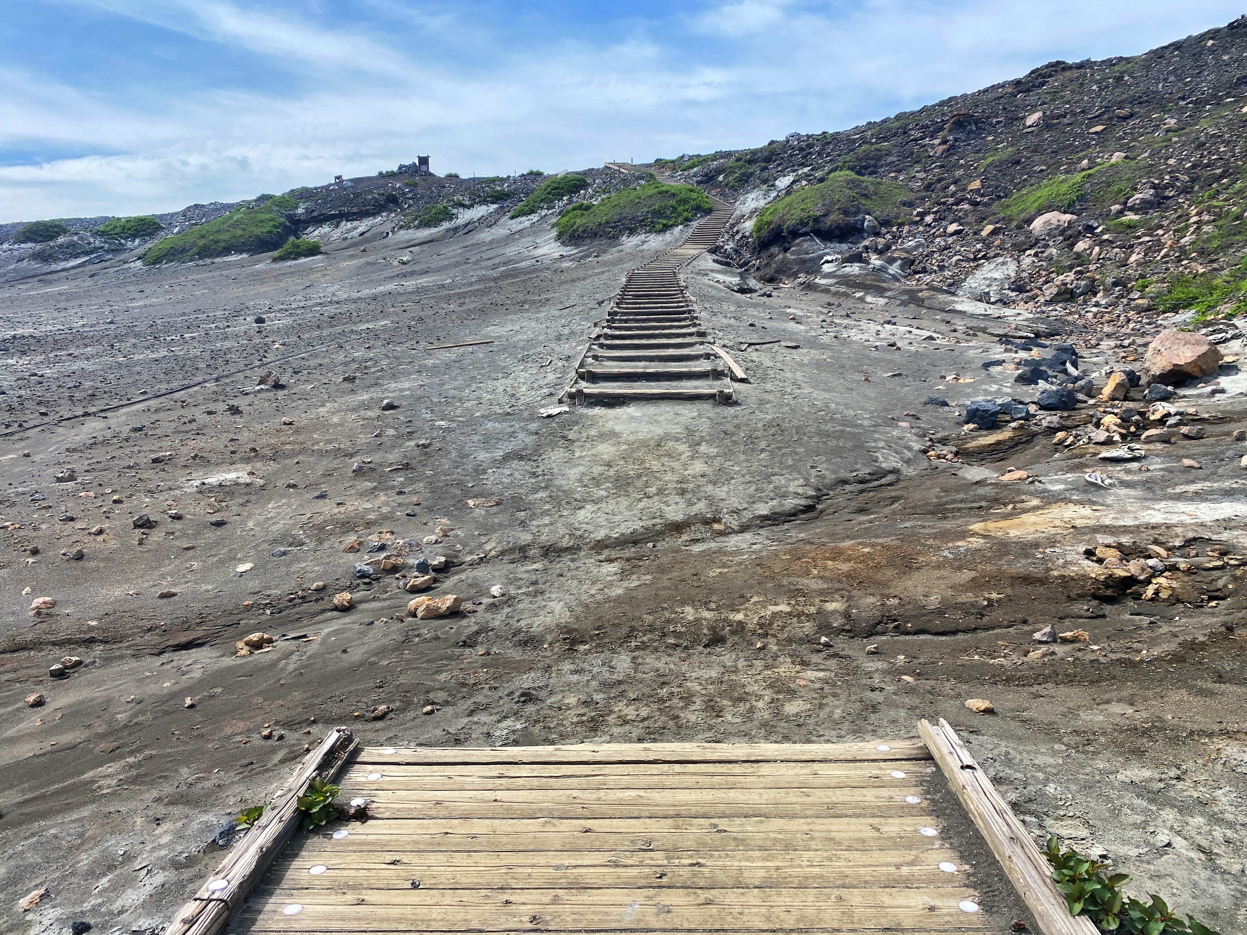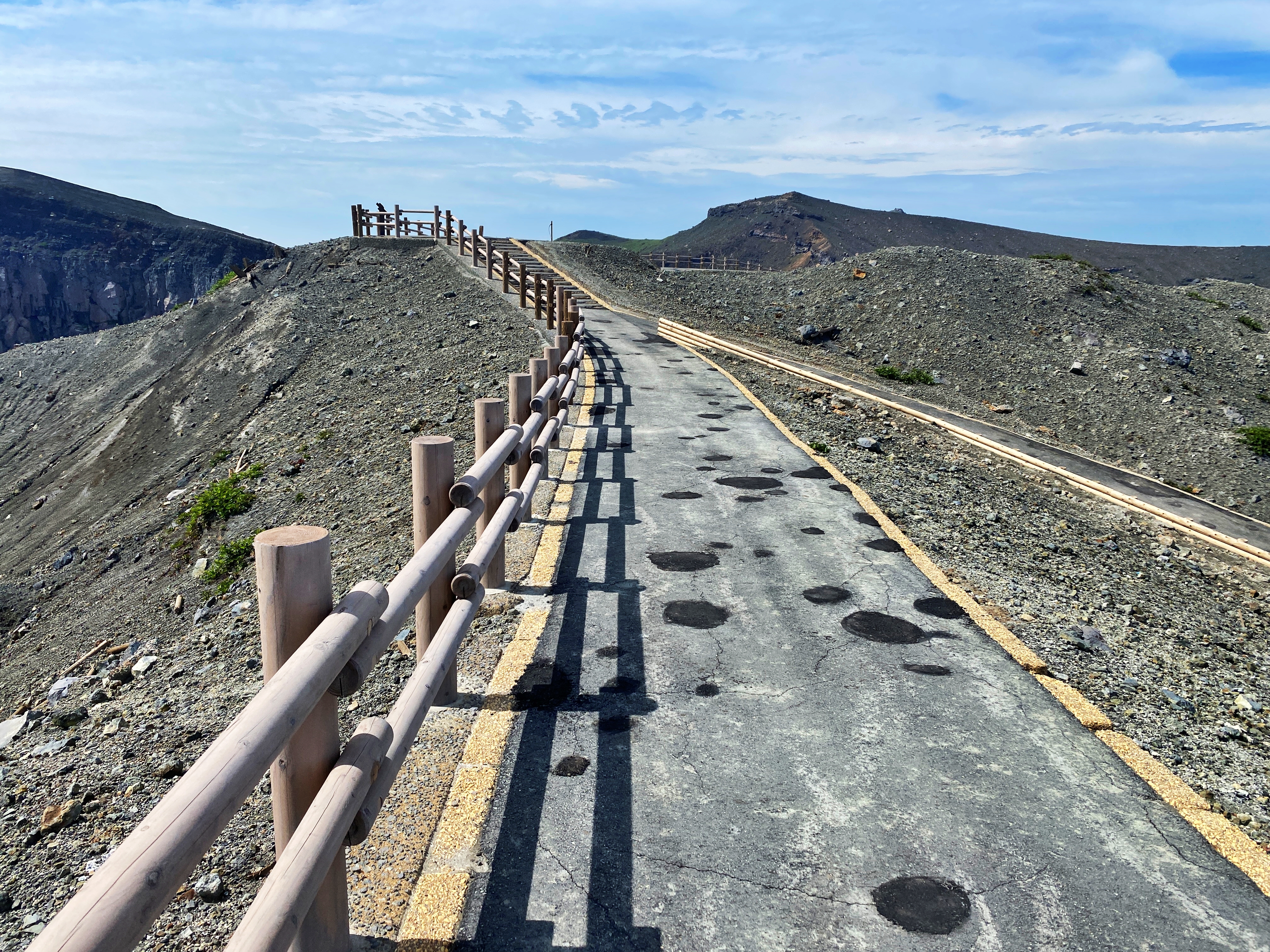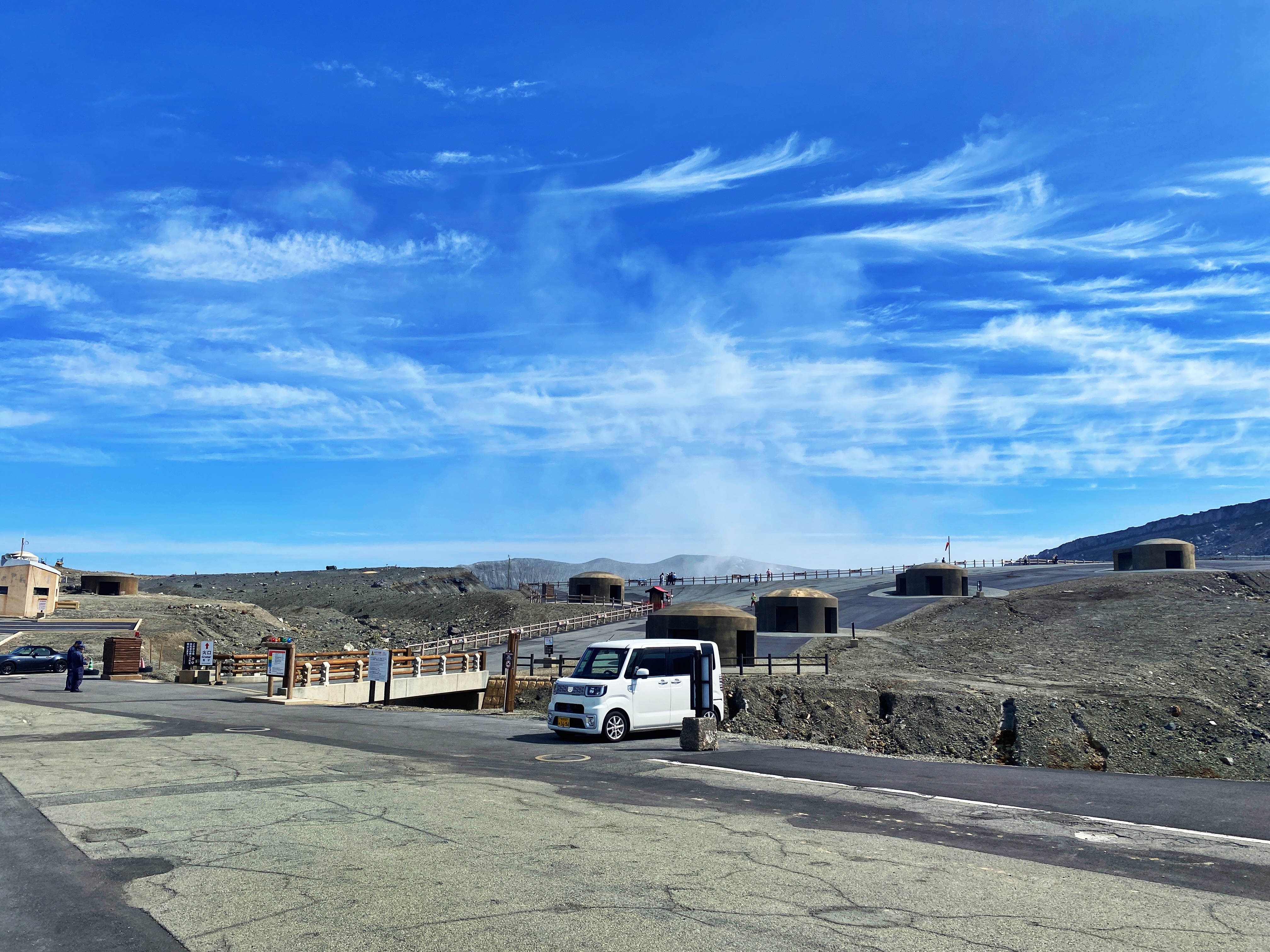예전에는 케이블카도 있었다고 하고 지금은 도보 여행객을 위한 셔틀버스도 다닙니다. 1000엔이면 분화구 입구 앞까지 올라온다고 하네요. 화산활동에 따라 언제 또 통제될지 올라가는 방법이 바뀔지 아무도 모릅니다.