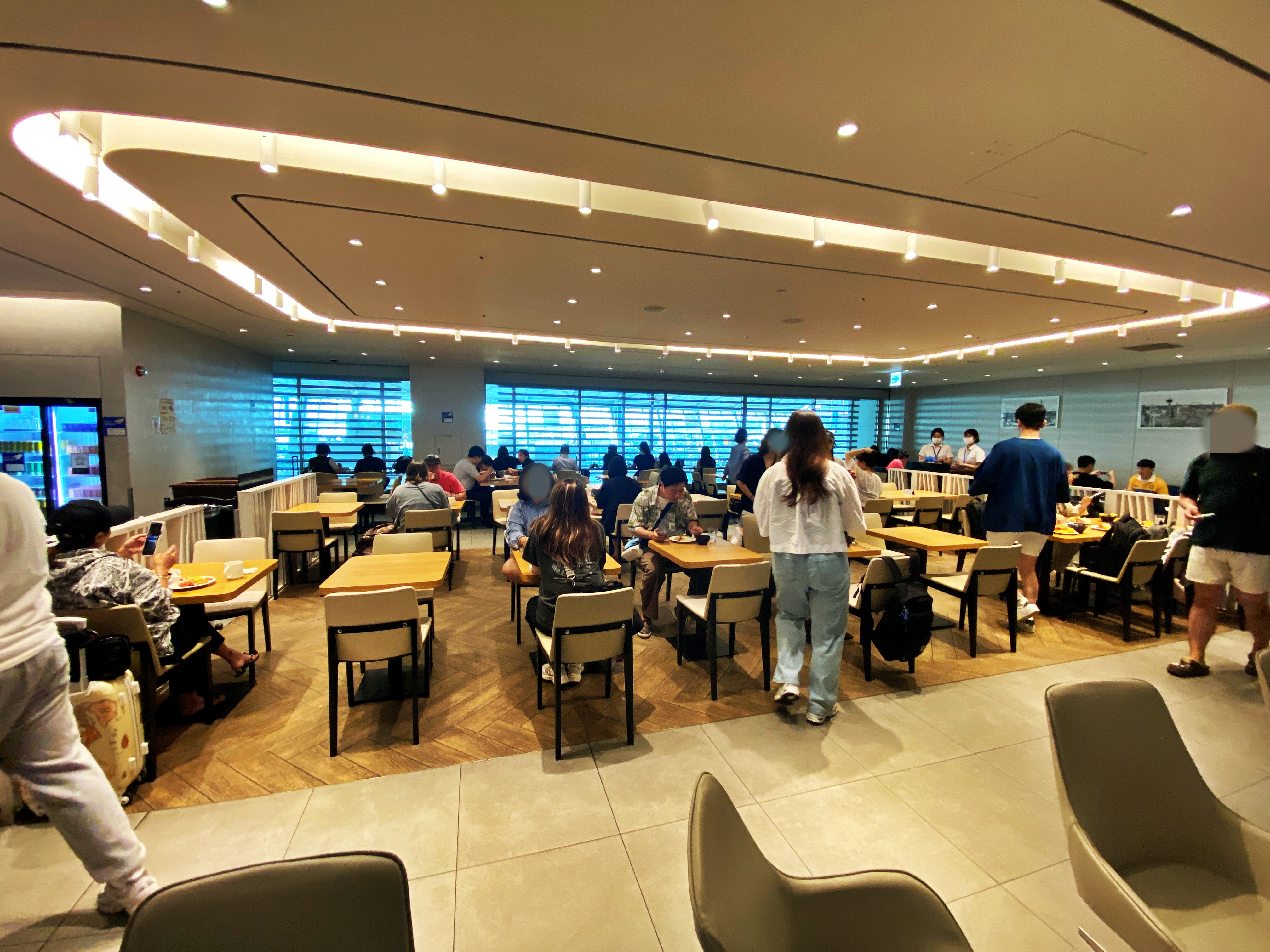 줄을 서서 기다리던 사람들이 라운지에 들어와서 아침식사를 하고 있습니다.