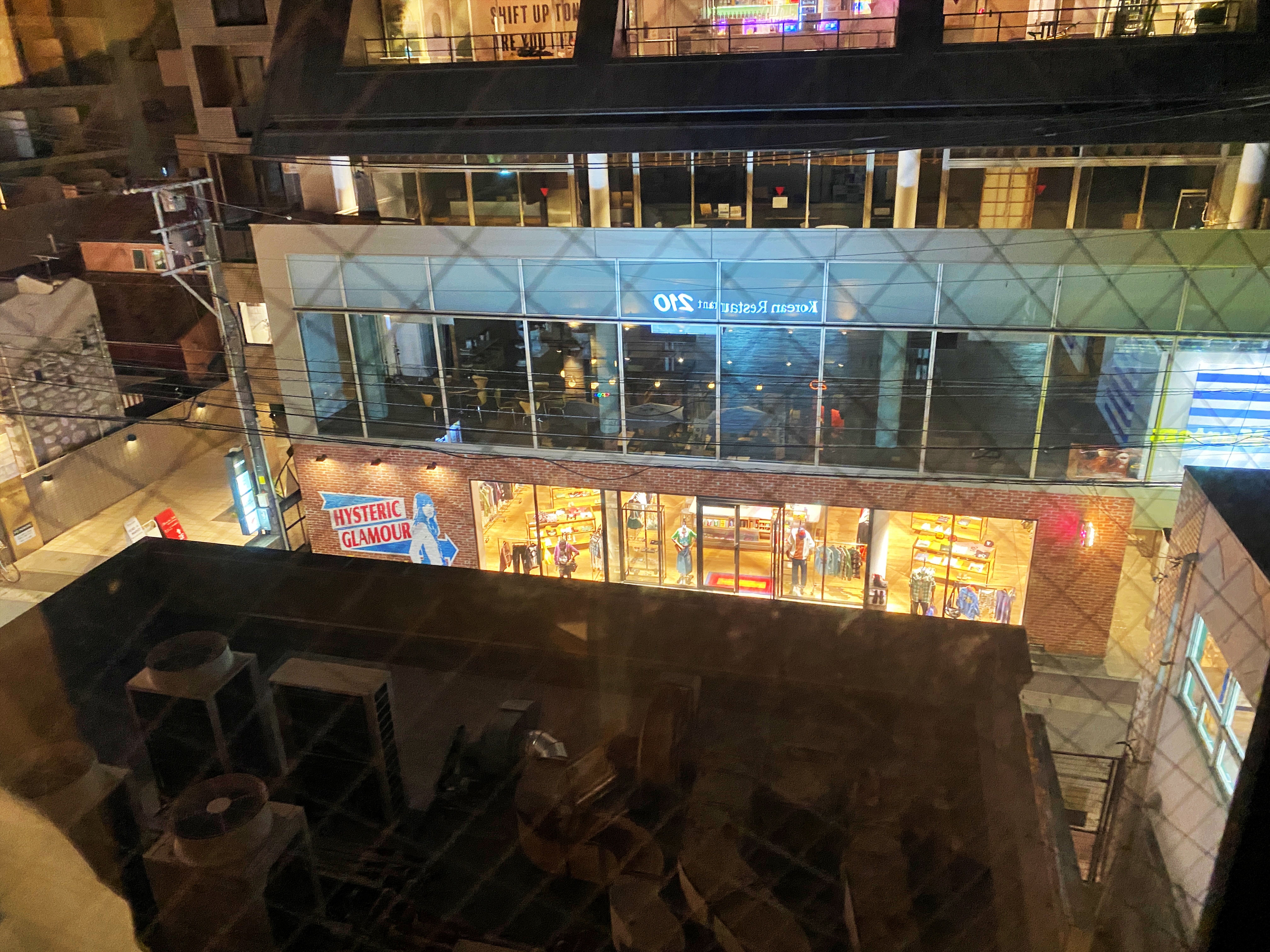 호텔 창문으로 보이는 4층 펍은 불야성입니다.