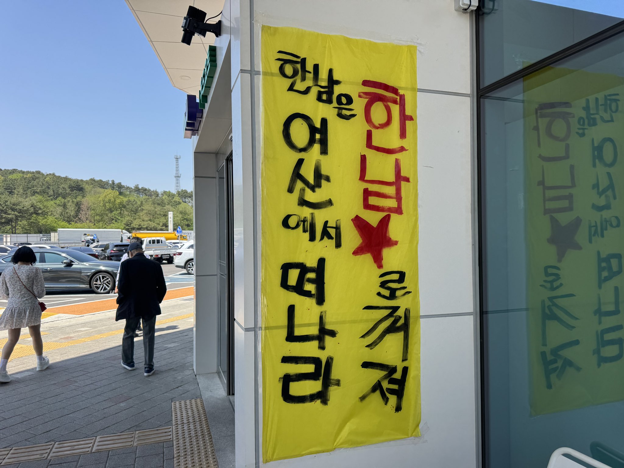 익산시 여산면의 여산(礪山)과 한자는 알 수 없지만 한남(韓男)은 분명 아닐 거라 생각되는 한남상사가 엮여 성별갈등으로 인한 대립을 연상시켰습니다만, 노조와 사측의 갈등으로 인해 걸린 현수막이었습니다.