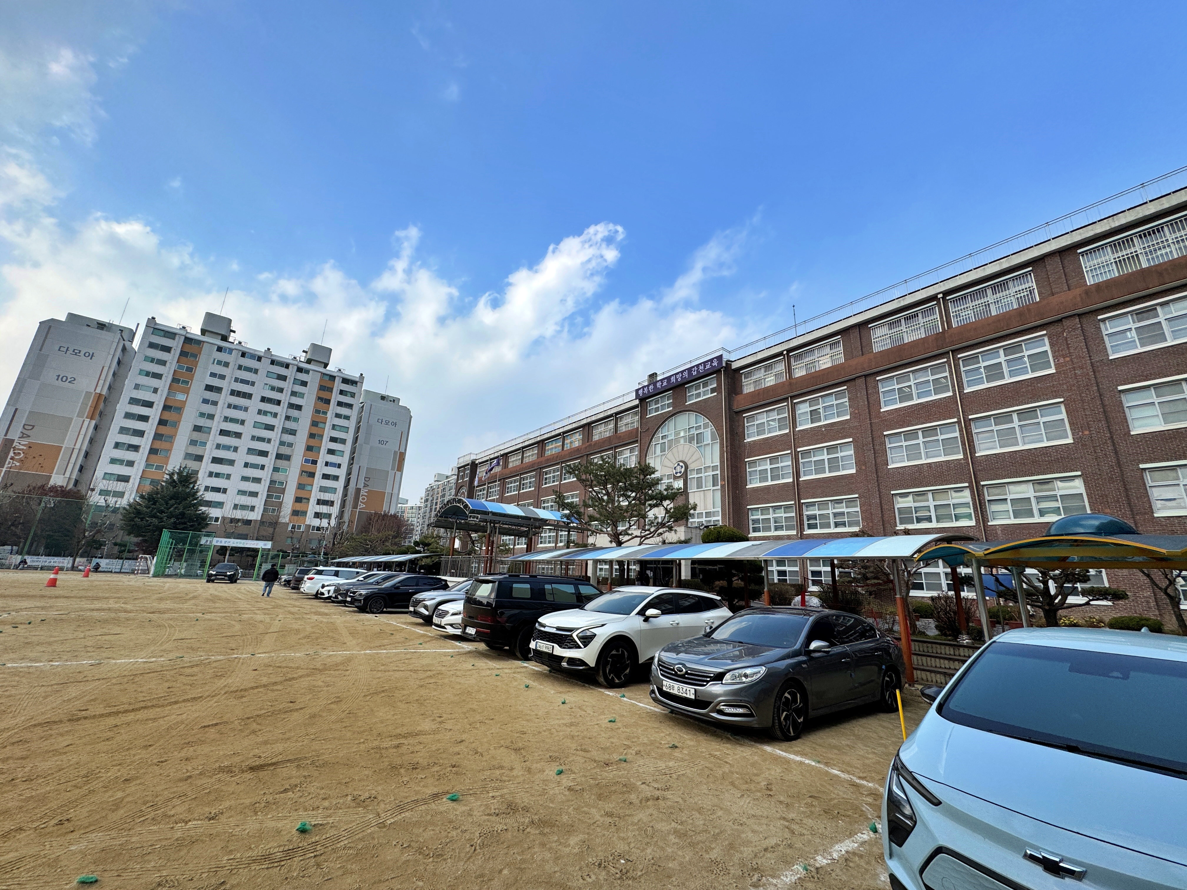 1기 신도시인 둔산신도시의 개발과 함께 생겨난 학교인지라 개교한 지 이제 30년이 넘었다고 합니다. 항상 수험표에는 주차장이 없으니 대중교통을 이용하라고 하지만 대전 쪽 학교들은 운동장을 비롯하여 교내 시설들을 개방하여 어떻게든 주차를 할 수 있도록 만들어 줘 주차에 큰 어려움은 없었습니다. 이번에도 운동장을 개방하여 운동장에 차를 세우고 들어갔네요.