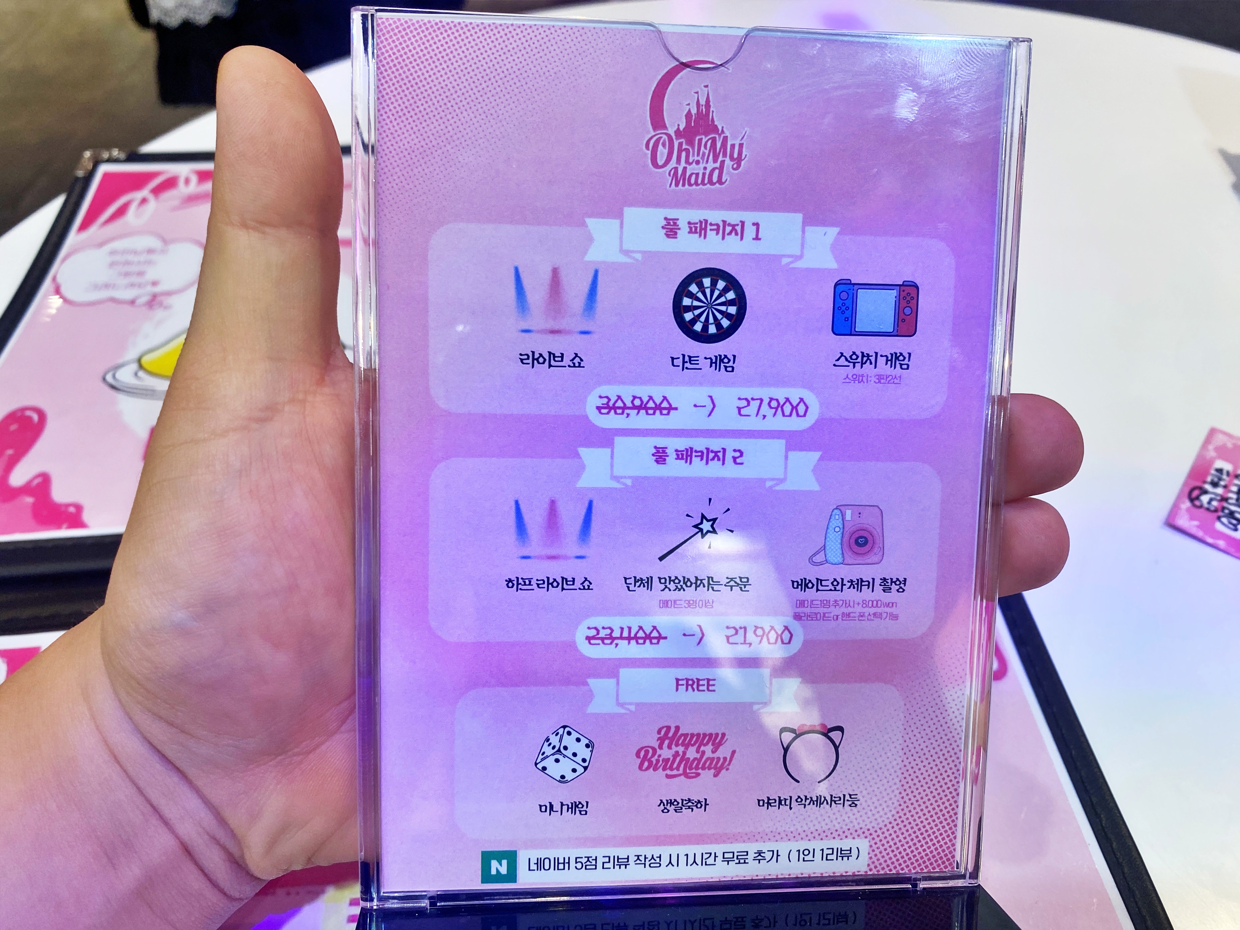 여타 개인 카페나 미용실등에서 쿠폰에 도장을 찍어주는 것과 다르지 않습니다. 음식값은 일본 메이드카페와 비슷하지만, 시간 연장비용이나 패키지로 묶여있는 콘텐츠들에 대한 비용은 확실히 조금씩 저렴합니다. 좋은 대체재 혹은 그 이상을 얻었습니다. 앞으로 종종 일이 바빠 일본에 가기 어려운 상황이지만 메이드카페에 가서 스트레스를 풀고 오고 싶을 때 혹은 누군가를 입문시키고 싶을 때 자주 찾아오지 않을까 생각됩니다.