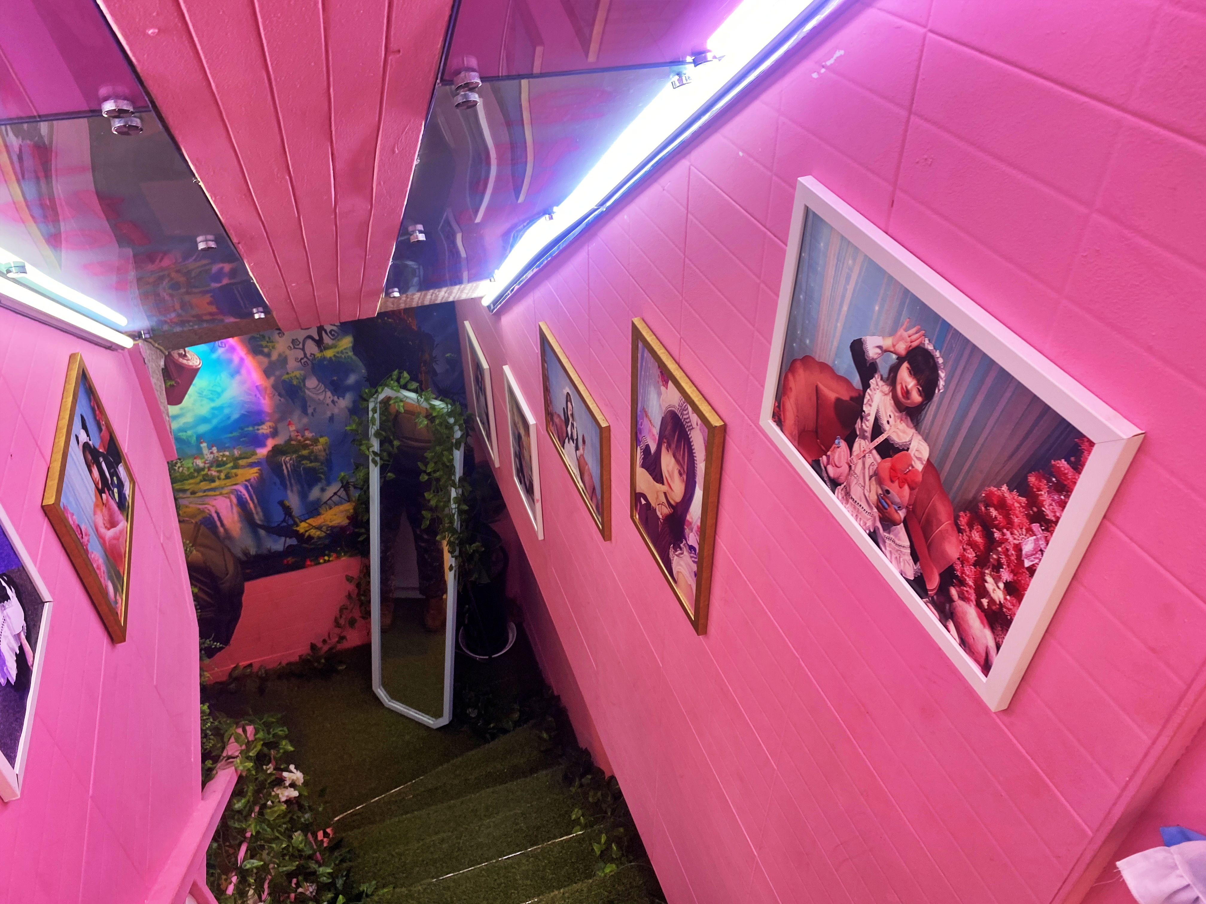 핑크빛 페인트와 밝은 조명이 어우러져 밝고 화려한 느낌이 듭니다.