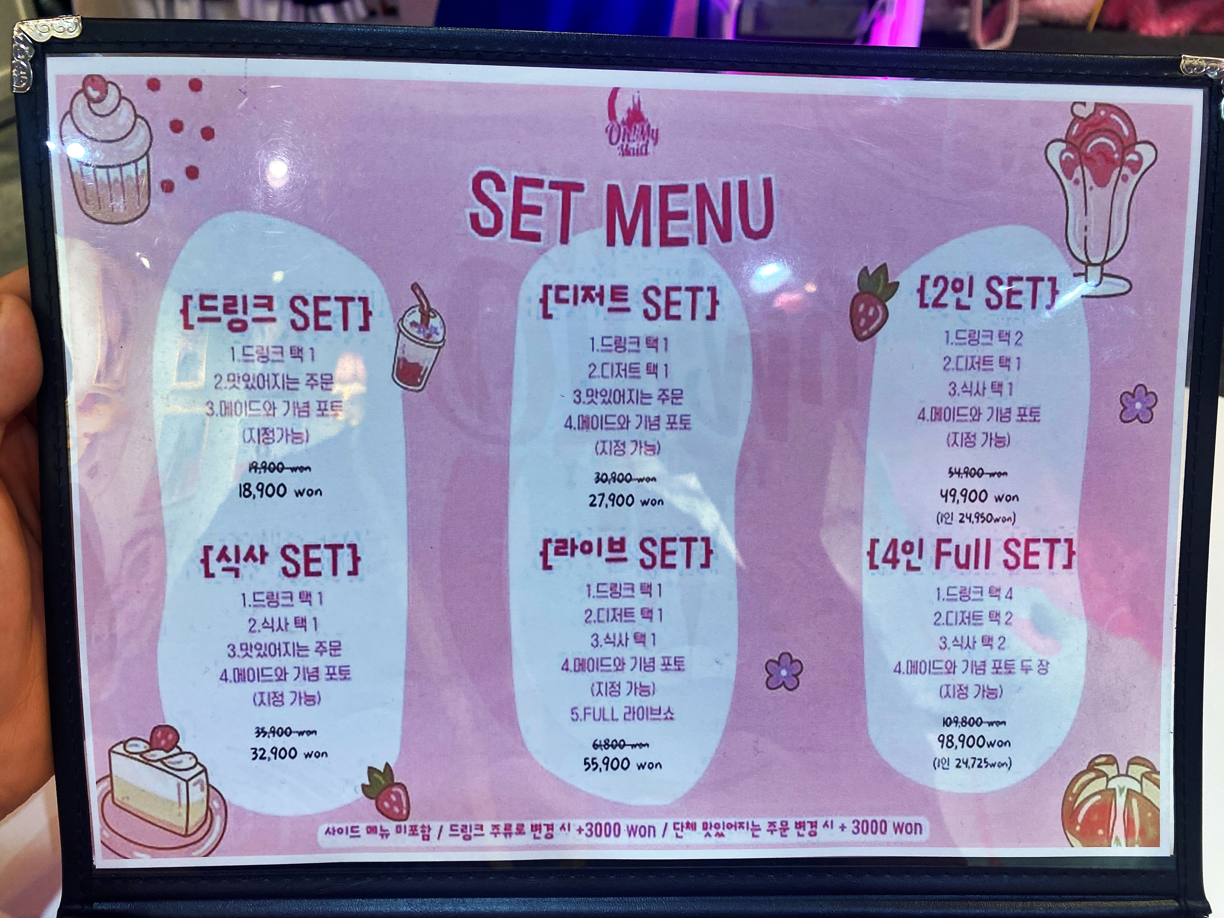 단품 메뉴에 대한 설명 이후 세트메뉴에 대한 설명이 이어집니다. 드링크 디저트 식사 라이브 세트와 함께 2인세트와 4인세트가 존재합니다. 풀코스에 준하는 코스를 선택해도 구성은 비슷하면서도 일본 메이드카페의 메뉴판보단 확실히 저렴합니다. 확실히 자리잡은 문화가 아닌지라 이보다 더 비싸면 망설일 사람들이 많겠죠.