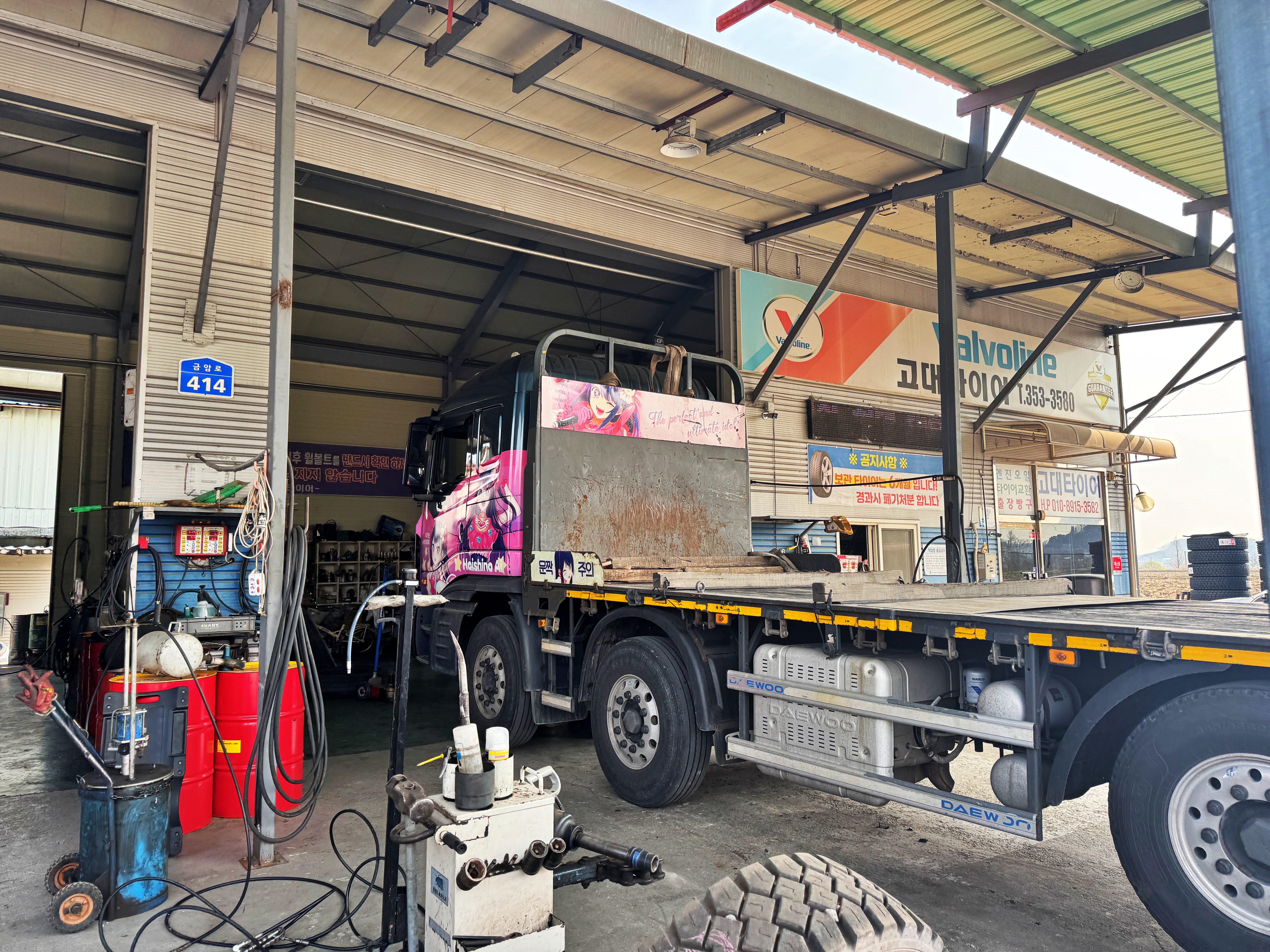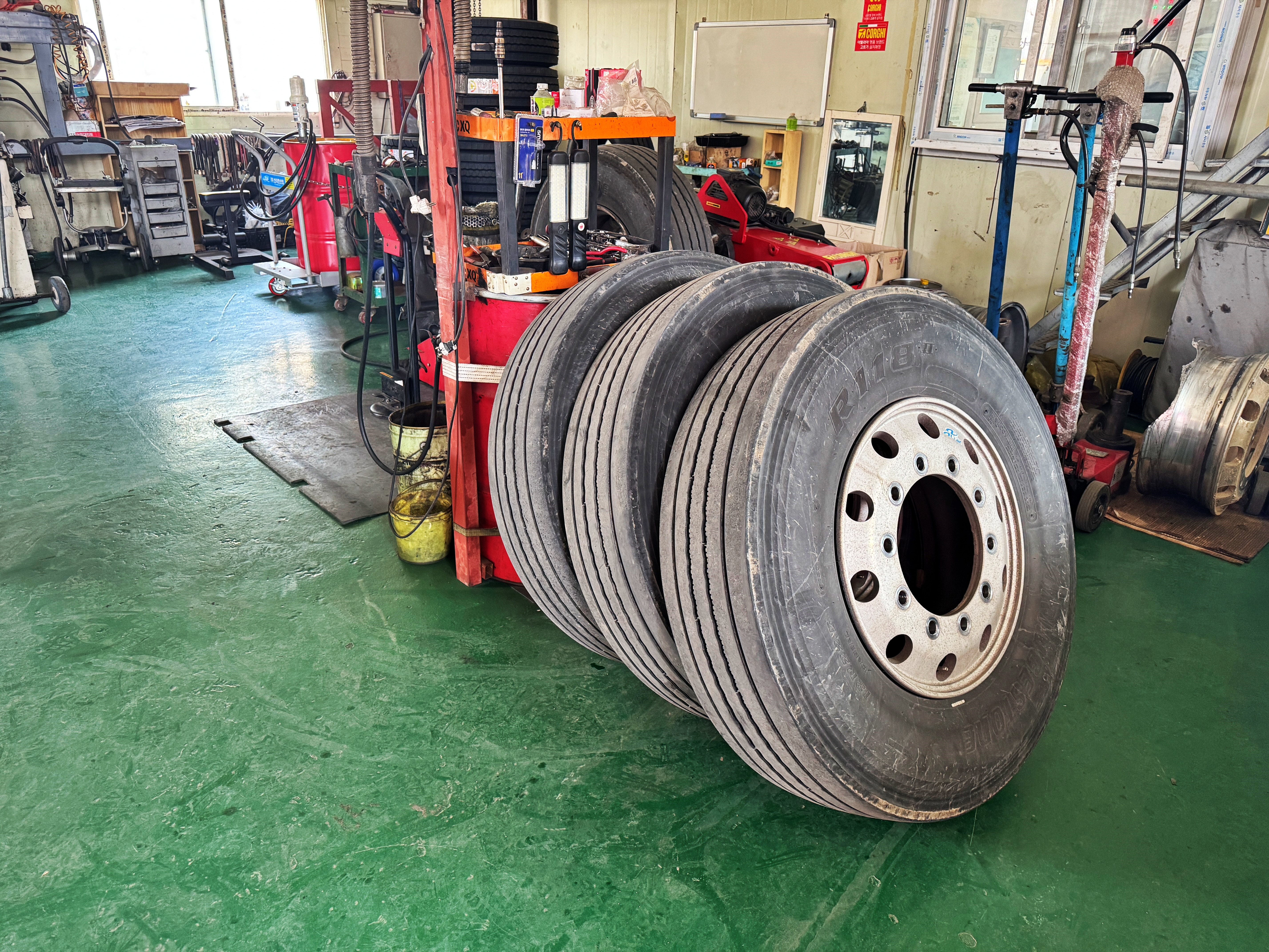 슬슬 날도 풀리고 노면 온도도 올라가는지라 기존의 1,2축 타이어를 거의 다 닳은 4축 자리로 보내고 1,2축 타이어를 새로 끼우기 위해 한산한 타이어집을 찾았습니다. 작년 가을에 5축에 끼웠다가 뺐던 타이어를 끼우고 장마철까지 버틸까 하다가 상태도 애매해서 그냥 전륜 타이어를 교체해 버렸네요.