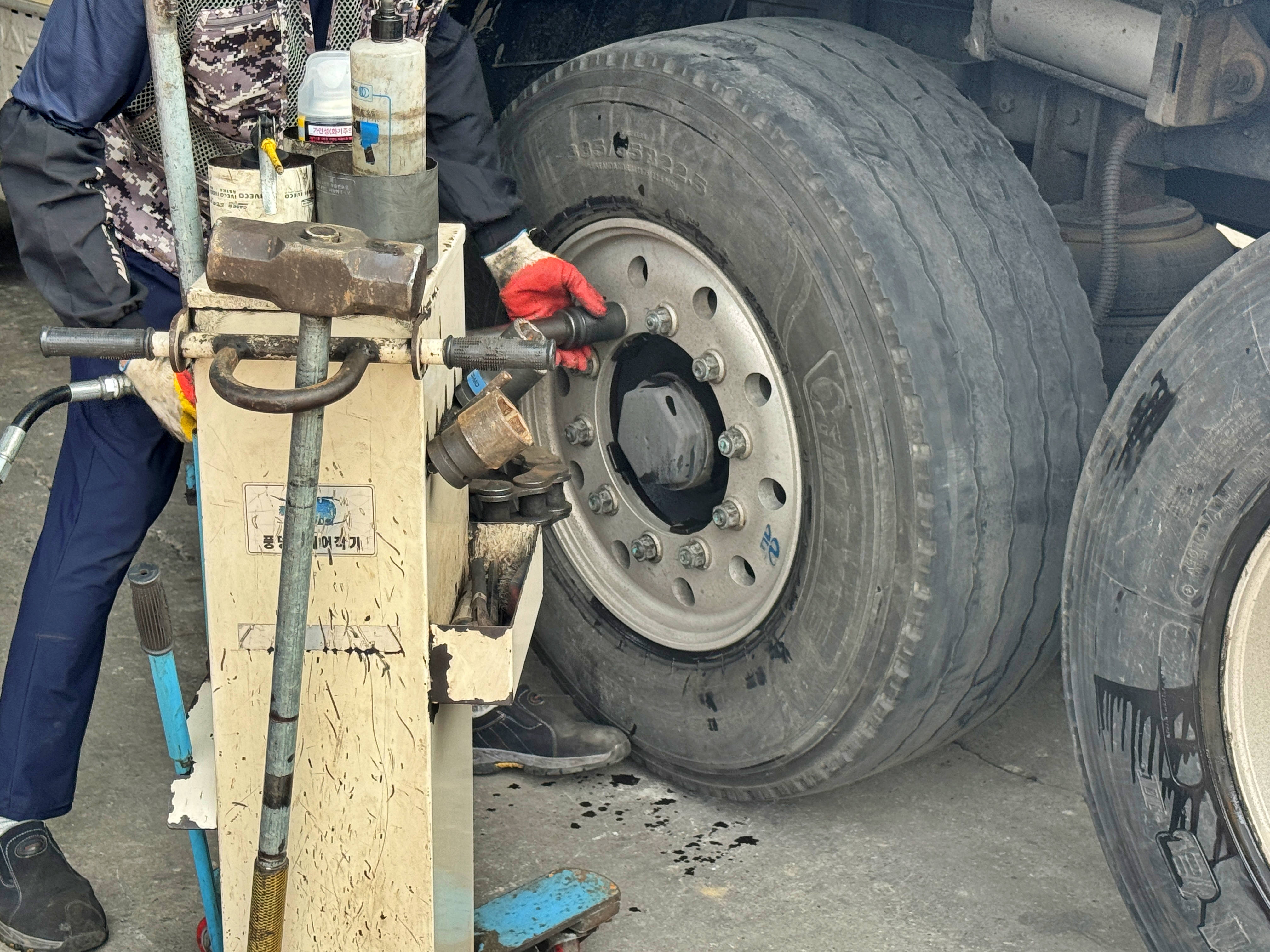 2축 안쪽이라 육안상 쉽게 확인이 되는 부분도 아녔던지라 이렇게 휠타이어를 뜯어내니 확인이 되는군요. 상대적으로 쉬운 후륜이면 몰라도 전륜 판스프링은 여기서는 수리가 어렵다고 하기에 타이어를 교체하고 바로 옆 타타대우로 가기로 했습니다..