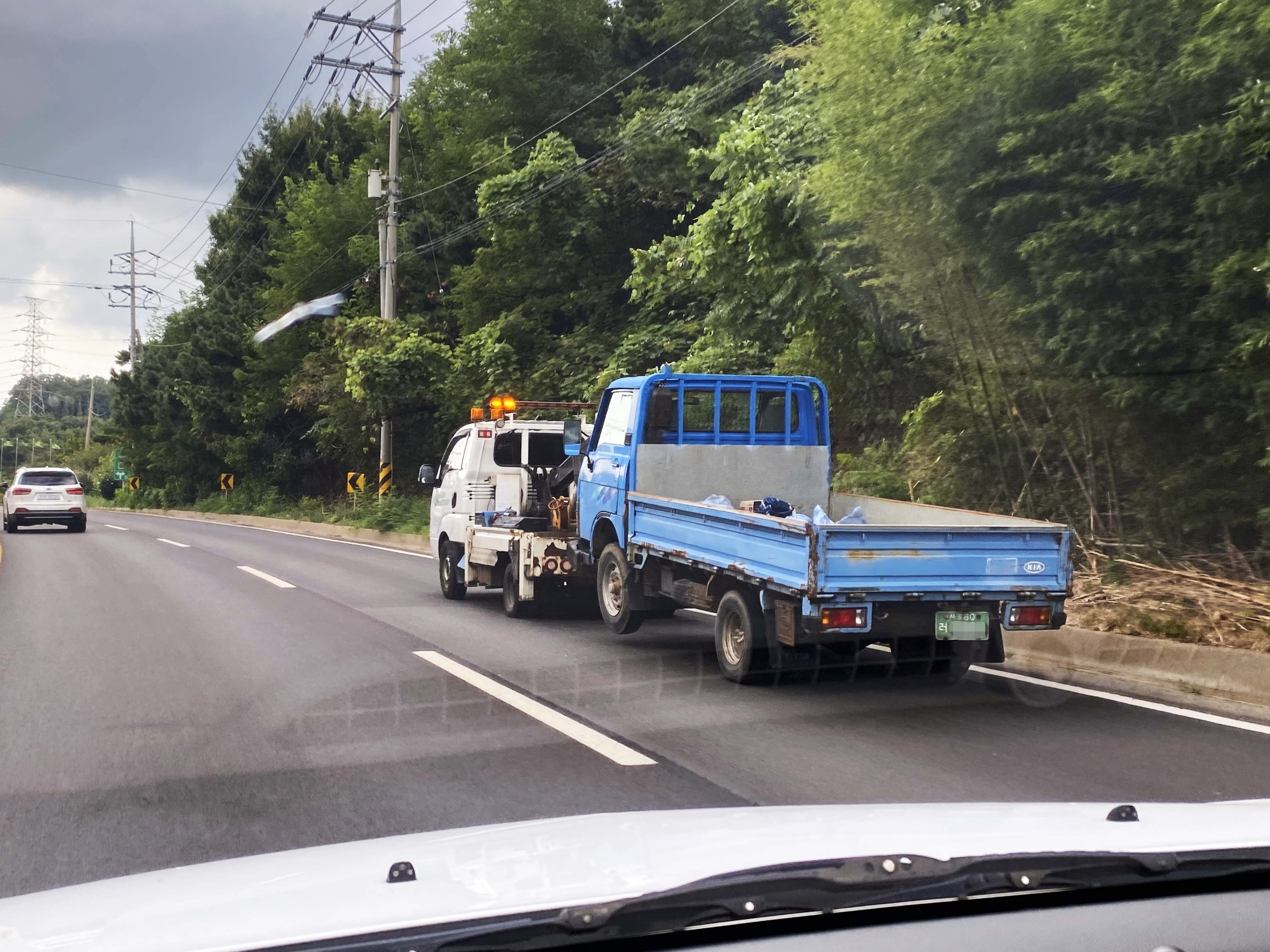 고속도로에서 쌍용 SY트럭과 함께 그럭저럭 보이는 차종이지만 대부분 94년 부분변경 이후 생산된 현대 데칼이 붙어있는 차량들입니다. 다만 이 차량은 그 차량들보다 훨씬 전에 생산된 미쓰비시 후소의 잔재가 남아있는 구형이라는 사실을 측면 탑을 보면 알 수 있지요.