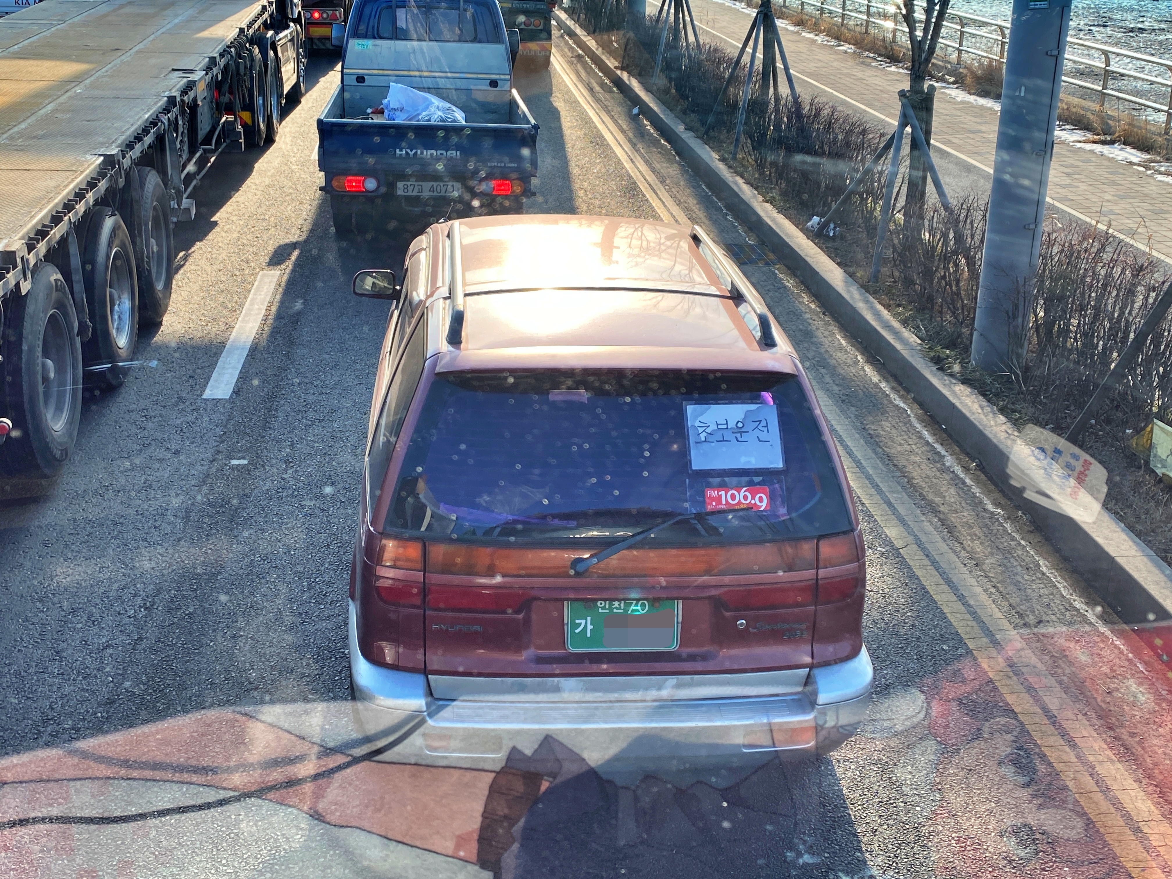 돈도 많아서 고급 수입차를 타면서 저 뒤가 아닌 만만해 보이는 거지 도태한남충의 생계형 대우트럭 앞으로 쳐 끼려는 약아빠진 인간들은 필사적으로 방어하지만, 이런 오래된 차는 방향지시등만 잘 켜면 공간을 내서라도 무조건 끼워줍니다. 그래서 초보운전이 붙은 싼타모를 앞에 끼워주고 짧은 시간이나마 이렇게 구경을 할 수 있었네요. 송도에서 앞으로도 주인과 함께 잘 달려주었으면 좋겠습니다.