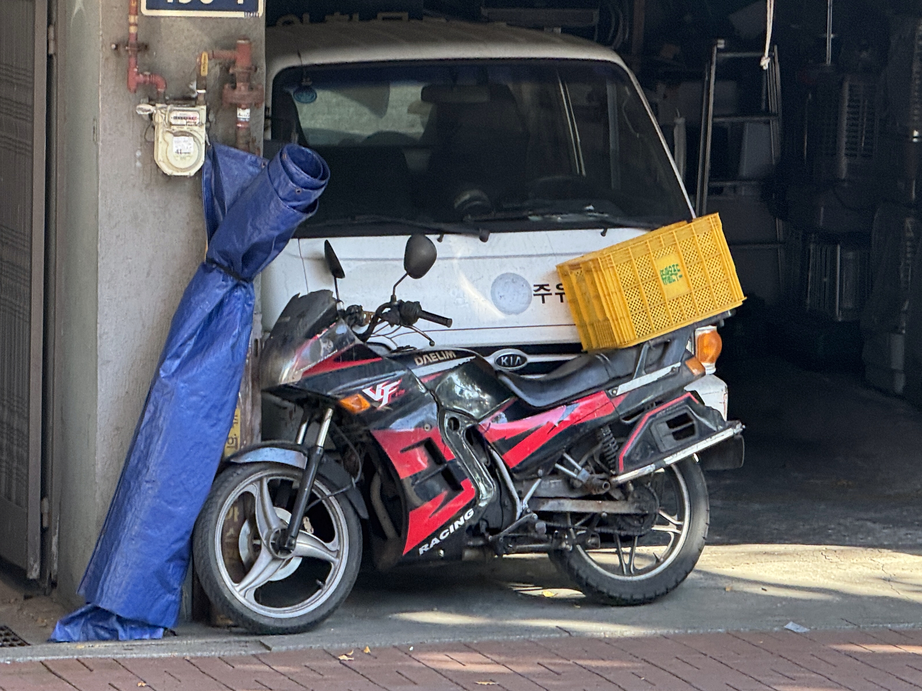 그 앞에 사과박스가 장착된 대림 VF125 오토바이가 세워져 있네요. 이 오토바이 역시 J2와 함께 90년대를 빛냈던 오토바이 중 하나입니다. 말통으로 배달 할 때는 오토바이를, 드럼으로 배달 할 때는 봉고 홈로리를 운행하시는듯 합니다. 재개발이 진행되지 않아 좁은 골목이 많고 아직도 기름보일러나 석유난로를 사용하는 곳이 많은지라 서울 도심 한복판임에도 자동차가 아닌 가정 배달을 주로 하며 석유만 취급하는 작은 유류취급소가 존재하더군요.