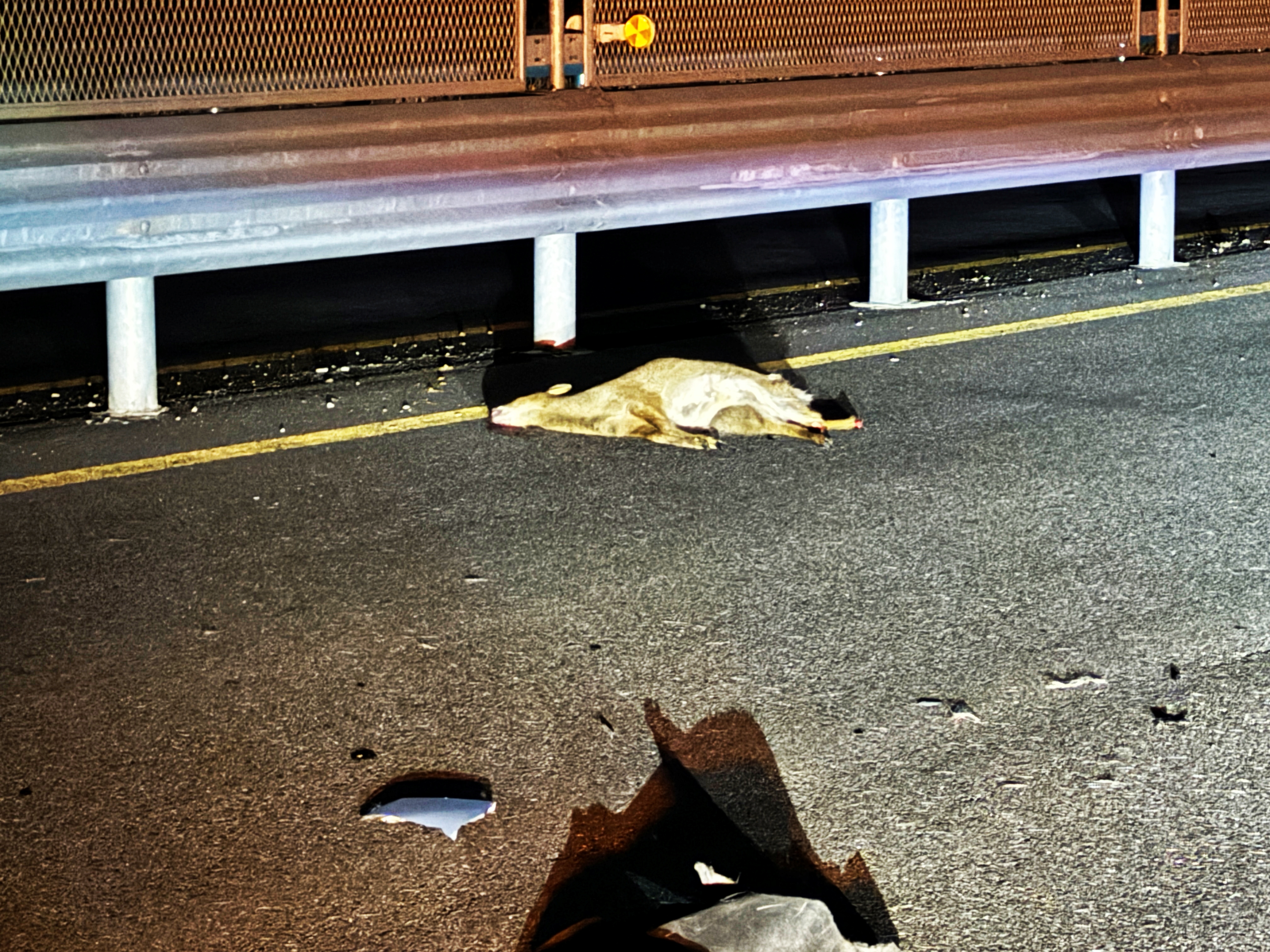 깨진 범퍼에서 떨어져 나온 잔해물들과 함께 중앙분리대 근처에 고라니가 죽어있습니다. 고라니에게 가해진 충격 역시 컸을 겁니다. 매년 가을에서 겨울로 넘어가는 시기만 되면 월동준비를 위해 내려오는 야생동물들이 많습니다. 물론 월동준비를 잘해서 겨울을 나는 동물들도 많지만 이렇게 로드킬로 죽는 동물들도 많습니다.
