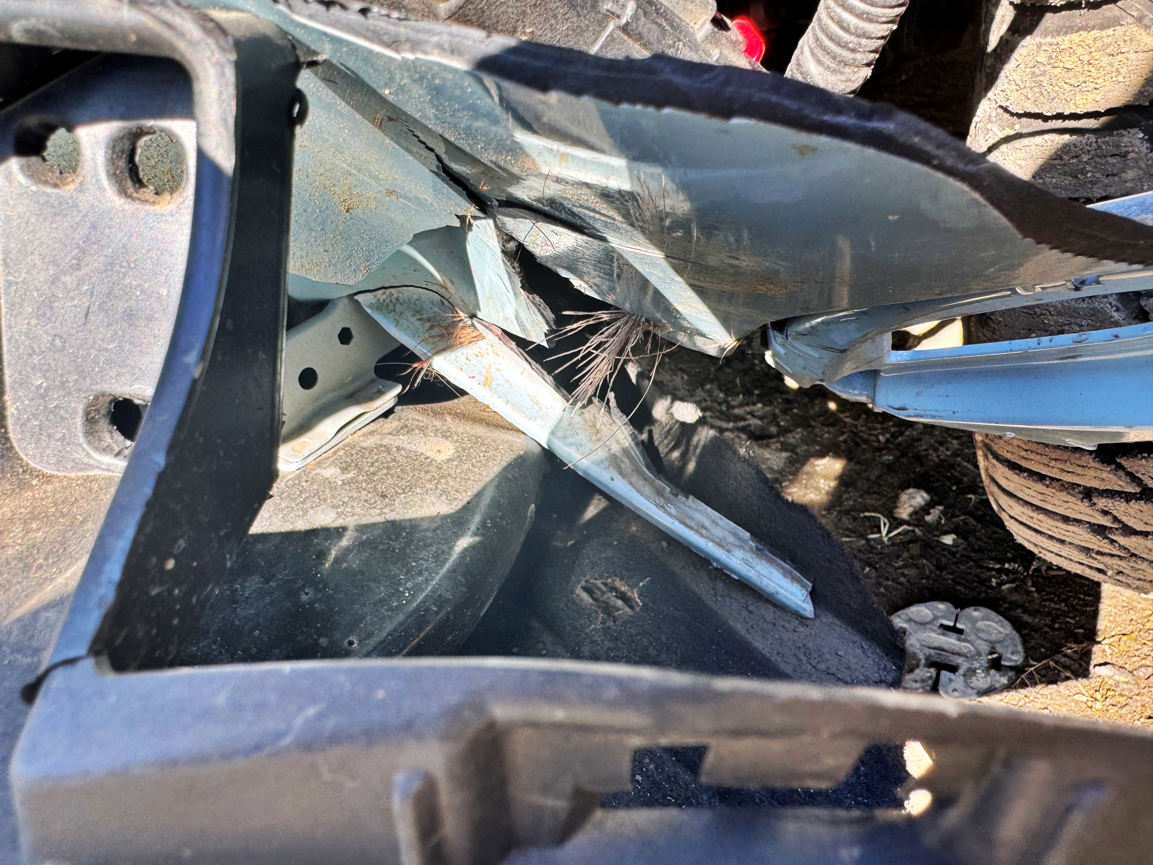 깨진 플라스틱 사이에 고라니의 털이 남아있습니다. 누가 봐도 고라니와 충돌했음을 알 수 있습니다.