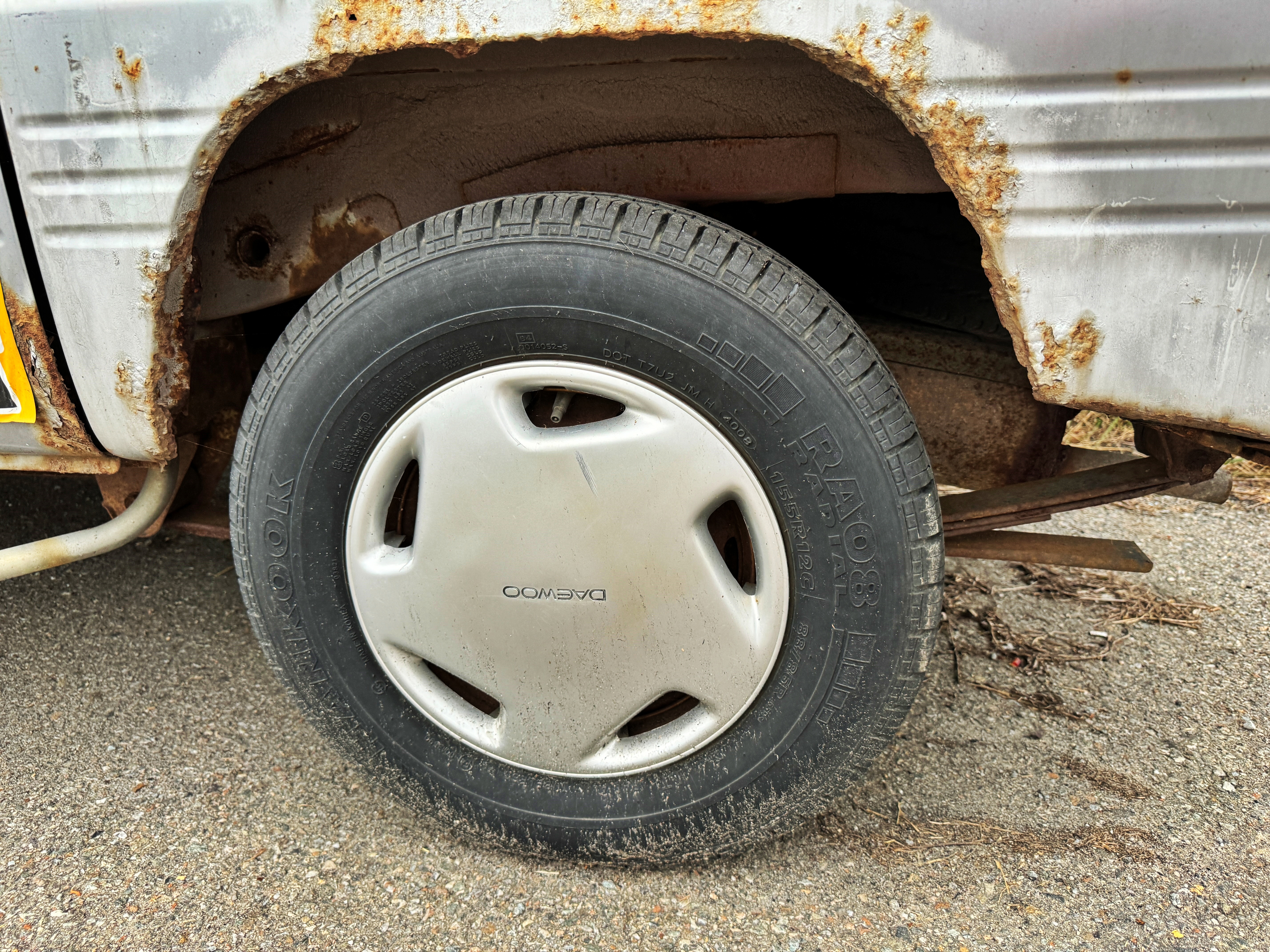 휠커버는 상당한 세월이 흘렀음에도 깔끔한 상태를 유지 중입니다. 타이어 규격은 155R12C. 다마스와 라보 그리고 20년 전 먼저 단종된 기아의 타우너와 12인치 휠을 사용하던 12년식 이전의 포터와 봉고 같은 1톤 트럭 후륜에 사용되는 규격입니다. 승용차용 타이어가 아닌지라 승차감은 당연히 좋지 않습니다.