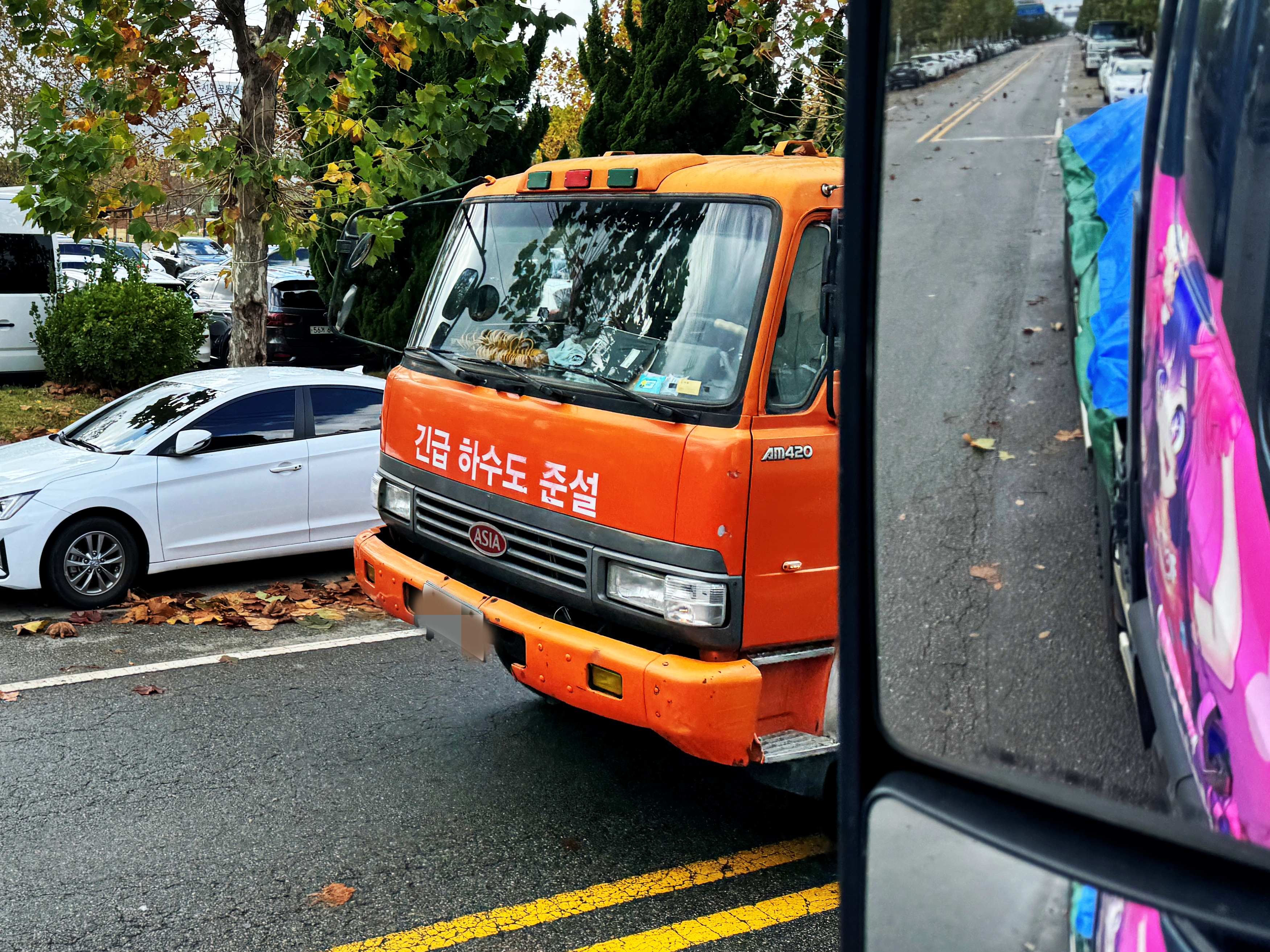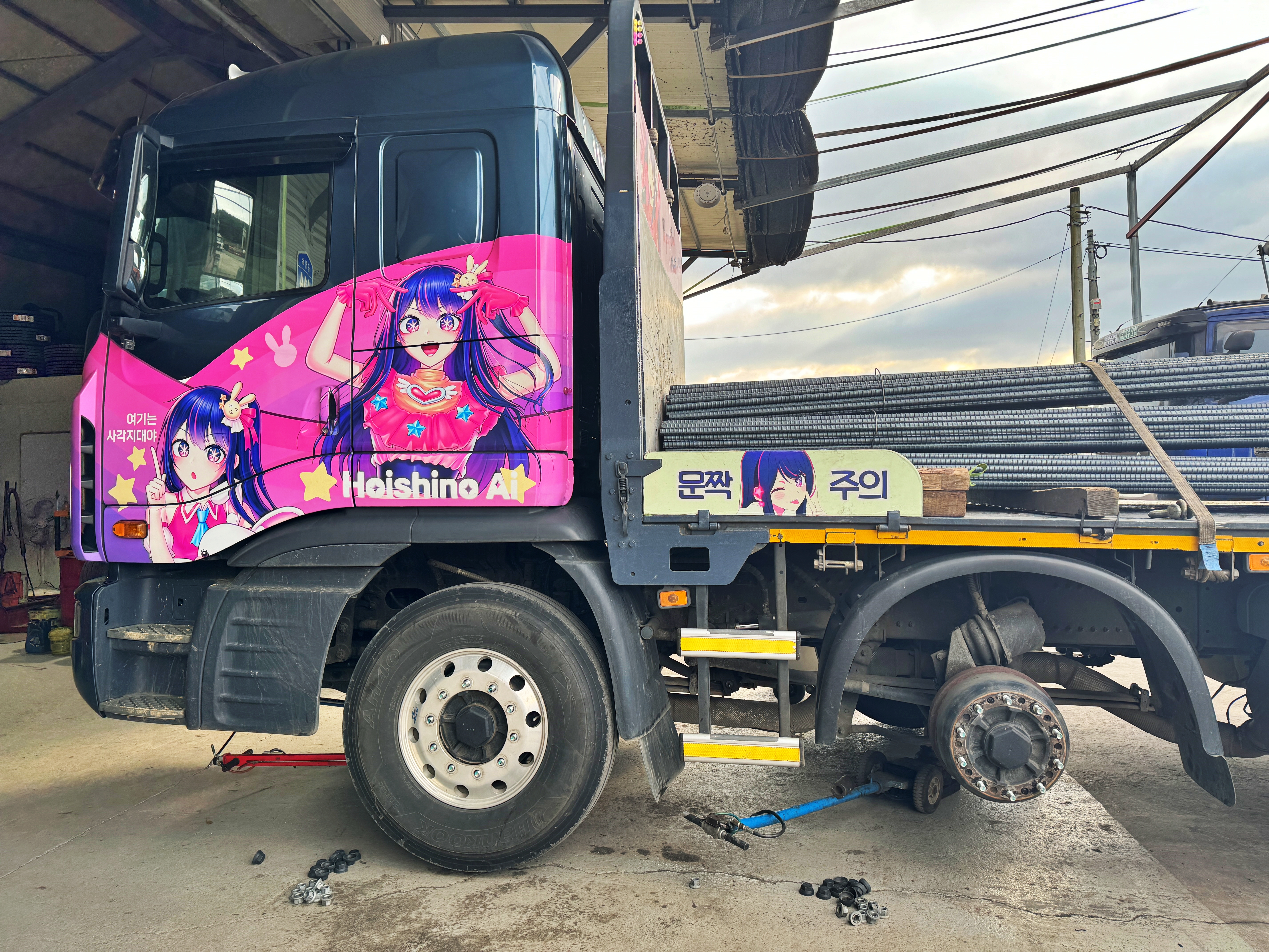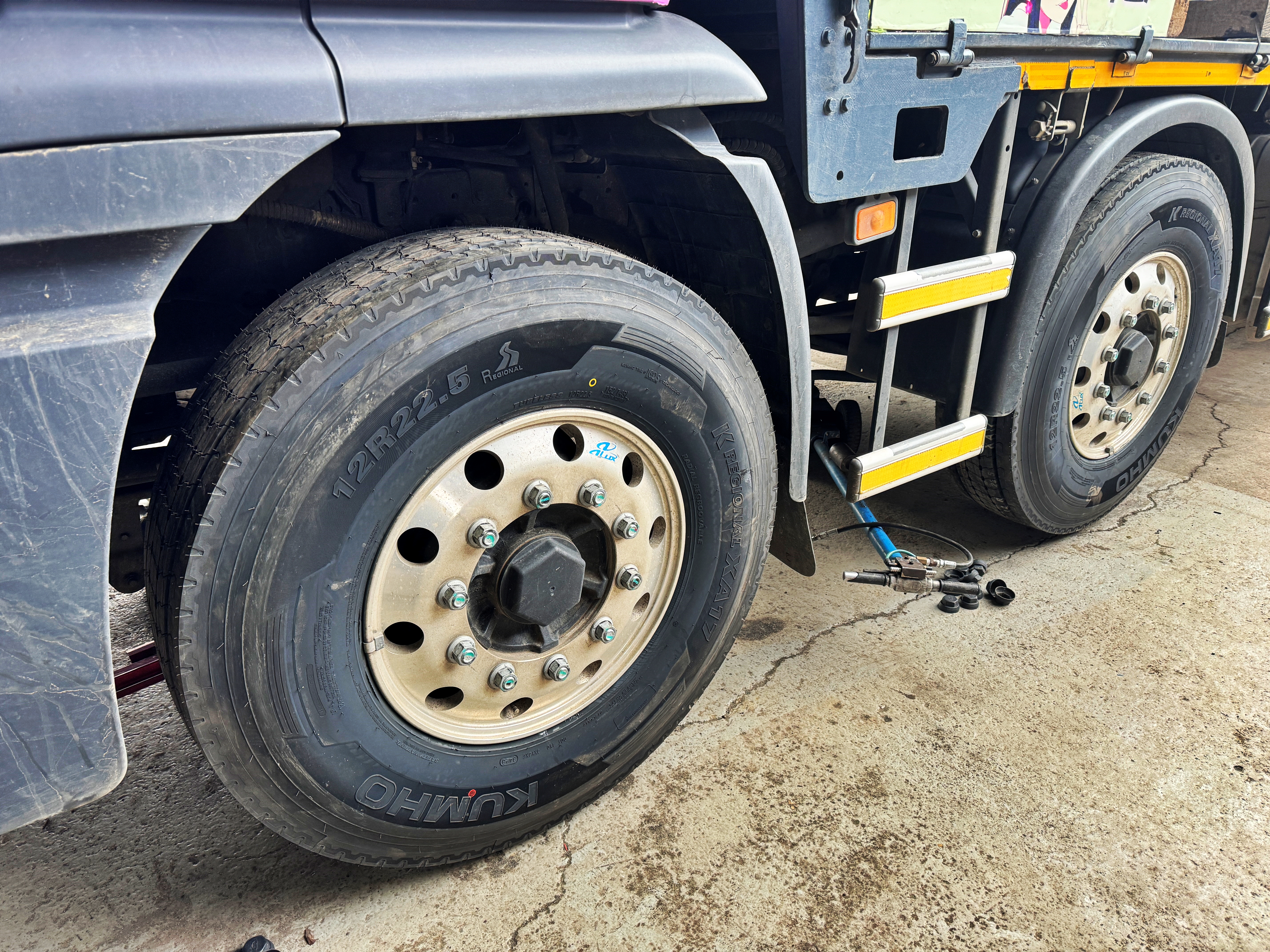 5축은 중국산 더블스타 아오센. 4축은 한국타이어 AH 40. 가변축인 3축은 385 규격의 브리지스톤. 1,2축은 금호타이어입니다. 5축 타이어의 교체주기가 돌아오지 않는 이상 당분간은 이렇게 다니지 않을까 생각됩니다.